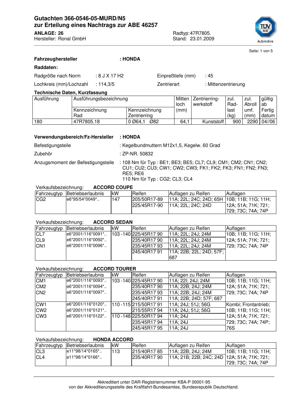 Dieses Gutachten (abe) bezieht sich auf die Alufelge Ronal 47R7805 in der Ausführung 8Jx17 ET 0, Mittenloch 0 mm (KBA 46257). Im PDF findest du typischerweise zulässige Reifengrößen, Auflagen/Anbauhinweise und – je nach Dokument – Hinweise zur Eintragung.