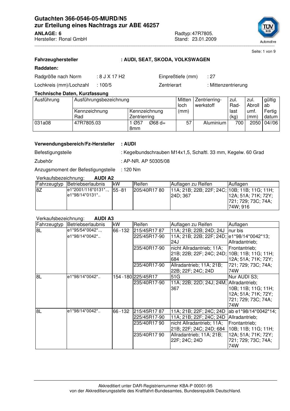 Dieses Gutachten (abe) bezieht sich auf die Alufelge Ronal 47R7805 in der Ausführung 8Jx17 ET 0, Mittenloch 0 mm (KBA 46257). Im PDF findest du typischerweise zulässige Reifengrößen, Auflagen/Anbauhinweise und – je nach Dokument – Hinweise zur Eintragung.