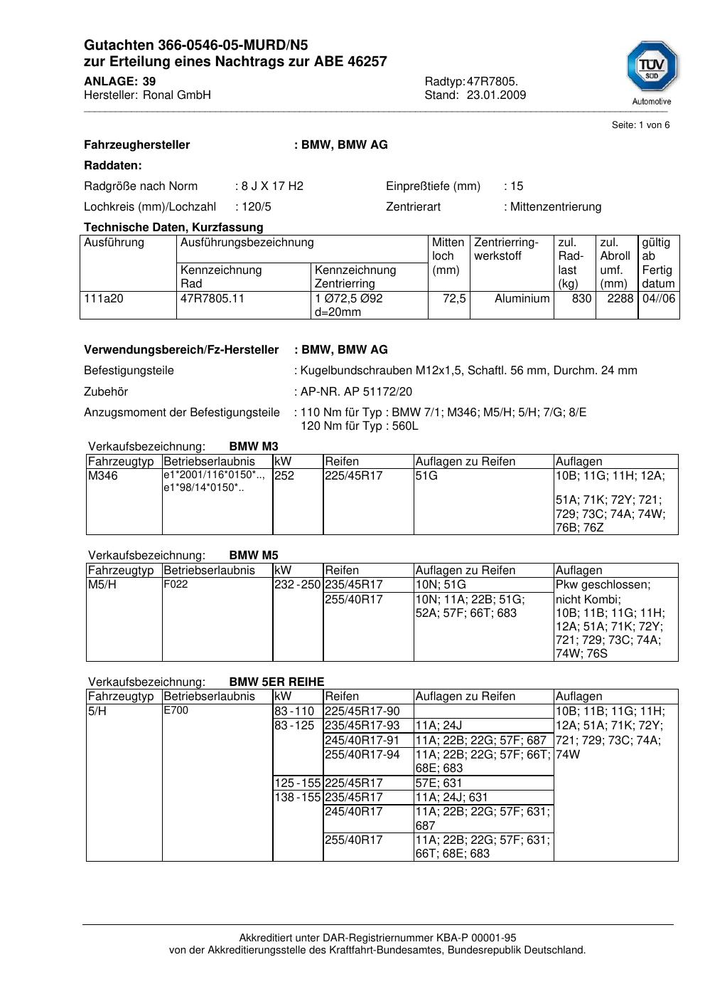 Dieses Gutachten (abe) bezieht sich auf die Alufelge Ronal 47R7805 in der Ausführung 8Jx17 ET 0, Mittenloch 0 mm (KBA 46257). Im PDF findest du typischerweise zulässige Reifengrößen, Auflagen/Anbauhinweise und – je nach Dokument – Hinweise zur Eintragung.