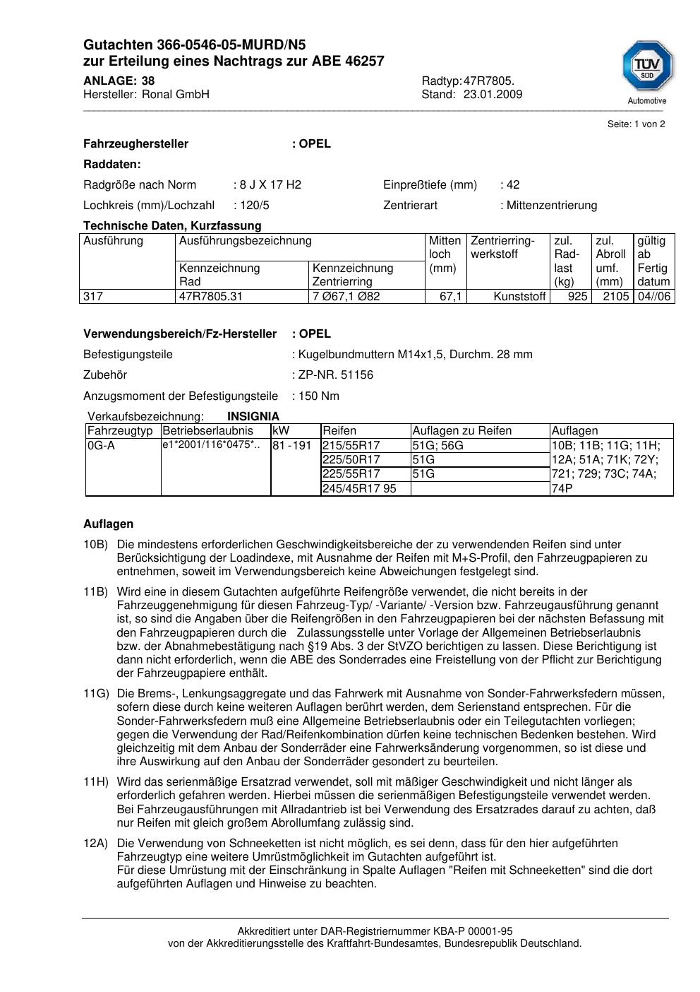 Dieses Gutachten (abe) bezieht sich auf die Alufelge Ronal 47R7805 in der Ausführung 8Jx17 ET 0, Mittenloch 0 mm (KBA 46257). Im PDF findest du typischerweise zulässige Reifengrößen, Auflagen/Anbauhinweise und – je nach Dokument – Hinweise zur Eintragung.