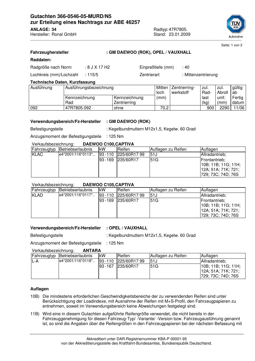 Dieses Gutachten (abe) bezieht sich auf die Alufelge Ronal 47R7805 in der Ausführung 8Jx17 ET 0, Mittenloch 0 mm (KBA 46257). Im PDF findest du typischerweise zulässige Reifengrößen, Auflagen/Anbauhinweise und – je nach Dokument – Hinweise zur Eintragung.