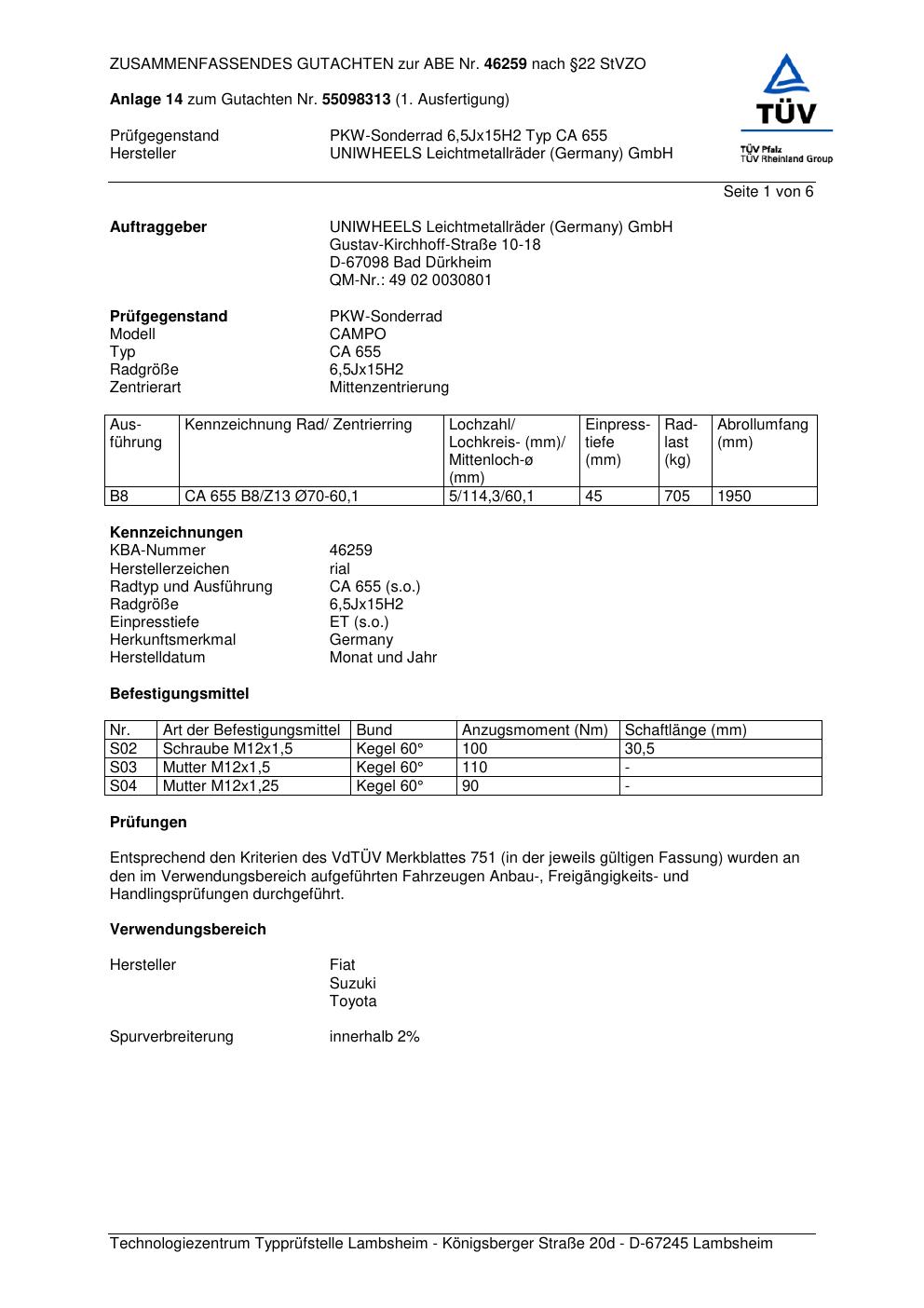 Dieses Gutachten (abe) bezieht sich auf die Alufelge brand-rial CA 655 in der Ausführung 6.5Jx15 ET 0, Mittenloch 0 mm (KBA 46259). Im PDF findest du typischerweise zulässige Reifengrößen, Auflagen/Anbauhinweise und – je nach Dokument – Hinweise zur Eintragung.