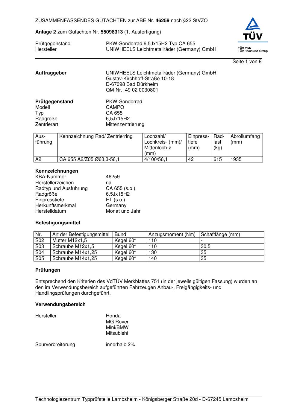 Dieses Gutachten (abe) bezieht sich auf die Alufelge brand-rial CA 655 in der Ausführung 6.5Jx15 ET 0, Mittenloch 0 mm (KBA 46259). Im PDF findest du typischerweise zulässige Reifengrößen, Auflagen/Anbauhinweise und – je nach Dokument – Hinweise zur Eintragung.