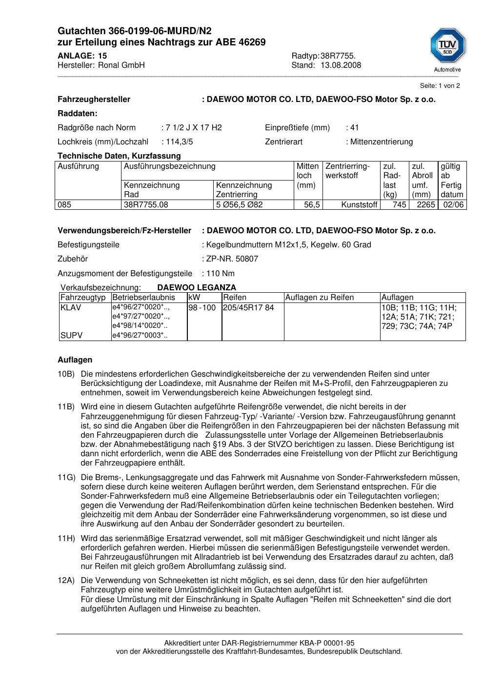 Dieses Gutachten (abe) bezieht sich auf die Alufelge Ronal 38R7755 in der Ausführung 2Jx17 ET 0, Mittenloch 0 mm (KBA 46269). Im PDF findest du typischerweise zulässige Reifengrößen, Auflagen/Anbauhinweise und – je nach Dokument – Hinweise zur Eintragung.