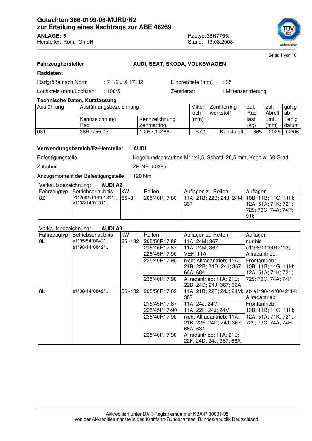 Dieses Gutachten (abe) bezieht sich auf die Alufelge Ronal 38R7755 in der Ausführung 2Jx17 ET 0, Mittenloch 0 mm (KBA 46269). Im PDF findest du typischerweise zulässige Reifengrößen, Auflagen/Anbauhinweise und – je nach Dokument – Hinweise zur Eintragung.