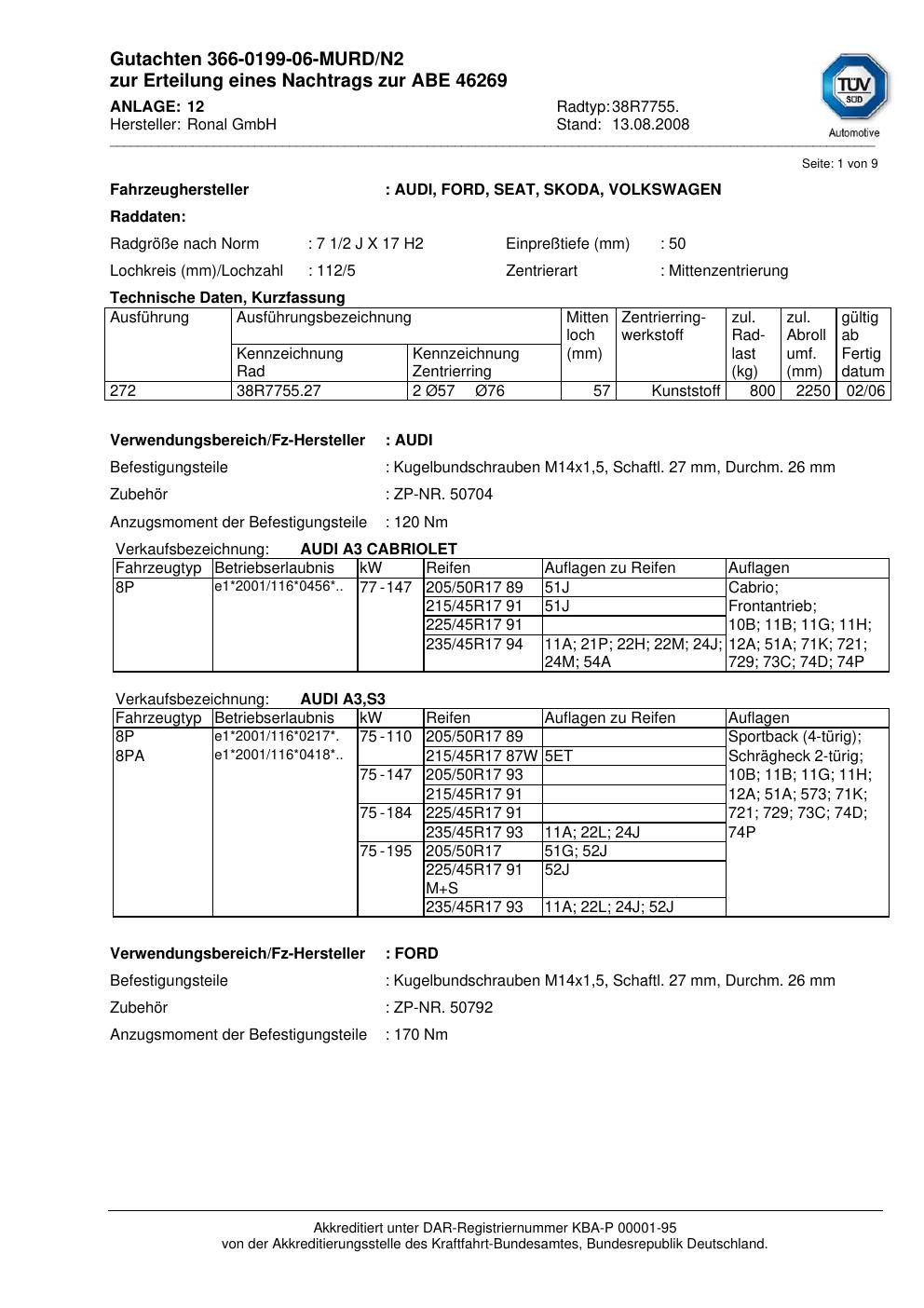 Dieses Gutachten (abe) bezieht sich auf die Alufelge Ronal 38R7755 in der Ausführung 2Jx17 ET 0, Mittenloch 0 mm (KBA 46269). Im PDF findest du typischerweise zulässige Reifengrößen, Auflagen/Anbauhinweise und – je nach Dokument – Hinweise zur Eintragung.