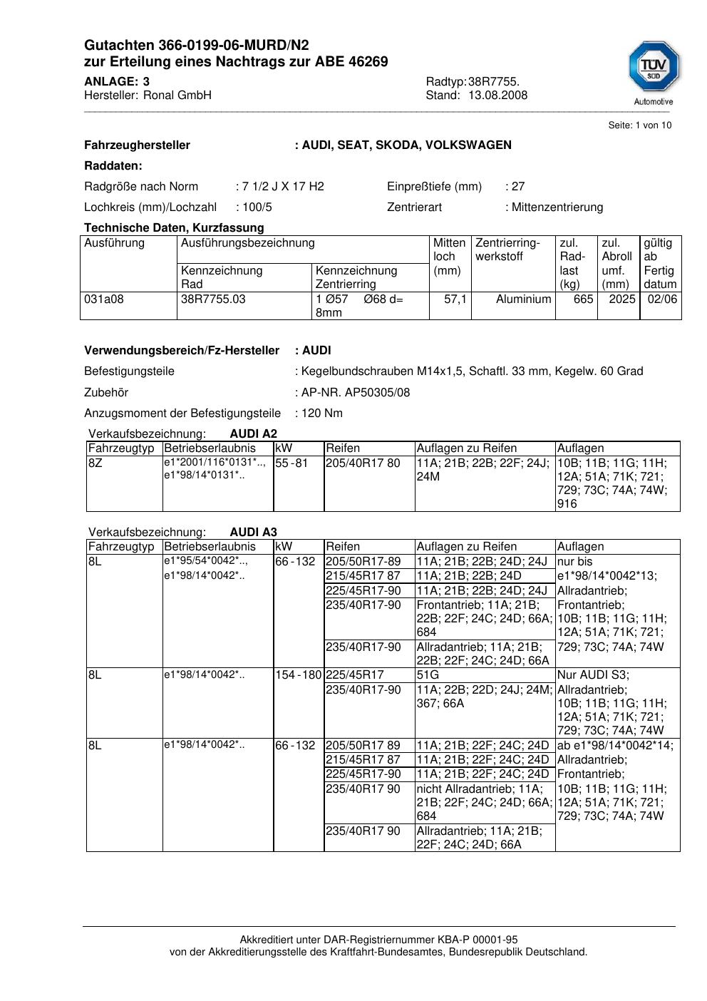 Dieses Gutachten (abe) bezieht sich auf die Alufelge Ronal 38R7755 in der Ausführung 2Jx17 ET 0, Mittenloch 0 mm (KBA 46269). Im PDF findest du typischerweise zulässige Reifengrößen, Auflagen/Anbauhinweise und – je nach Dokument – Hinweise zur Eintragung.