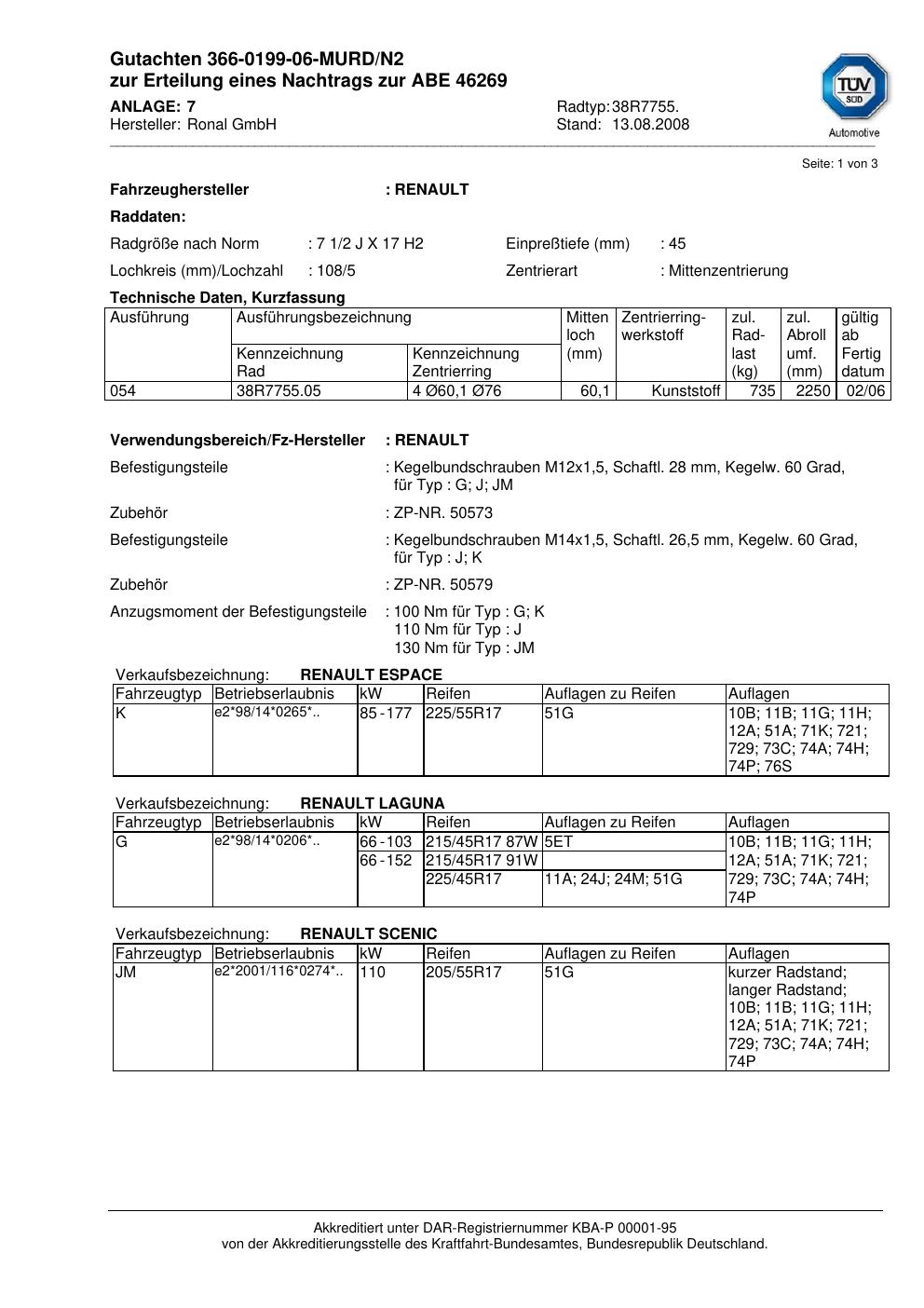 Dieses Gutachten (abe) bezieht sich auf die Alufelge Ronal 38R7755 in der Ausführung 2Jx17 ET 0, Mittenloch 0 mm (KBA 46269). Im PDF findest du typischerweise zulässige Reifengrößen, Auflagen/Anbauhinweise und – je nach Dokument – Hinweise zur Eintragung.