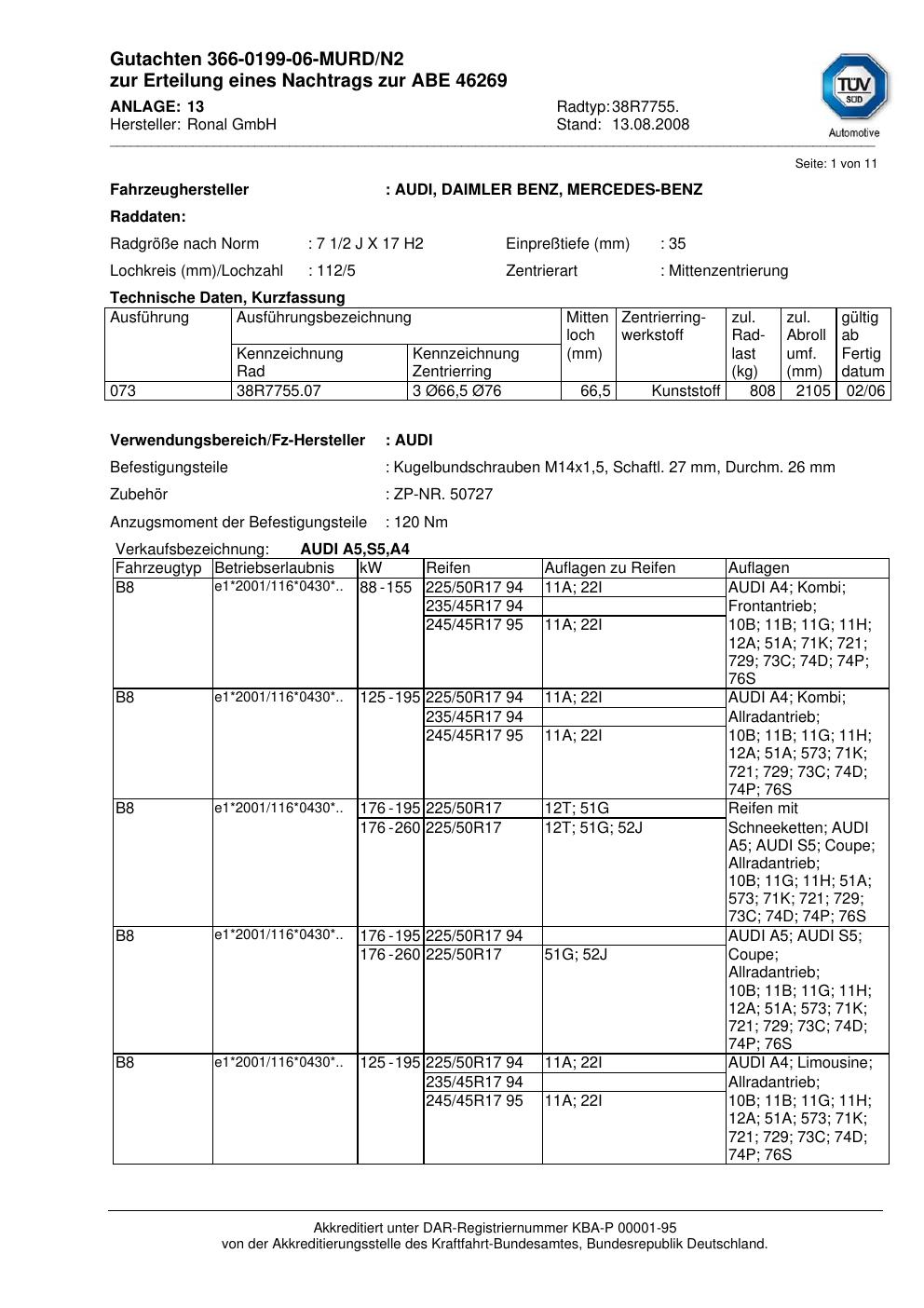Dieses Gutachten (abe) bezieht sich auf die Alufelge Ronal 38R7755 in der Ausführung 2Jx17 ET 0, Mittenloch 0 mm (KBA 46269). Im PDF findest du typischerweise zulässige Reifengrößen, Auflagen/Anbauhinweise und – je nach Dokument – Hinweise zur Eintragung.