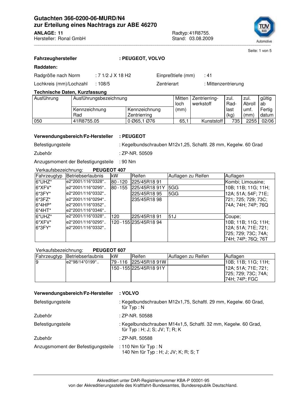 Dieses Gutachten (abe) bezieht sich auf die Alufelge Ronal 41R8755 in der Ausführung 2Jx18 ET 0, Mittenloch 0 mm (KBA 46270). Im PDF findest du typischerweise zulässige Reifengrößen, Auflagen/Anbauhinweise und – je nach Dokument – Hinweise zur Eintragung.