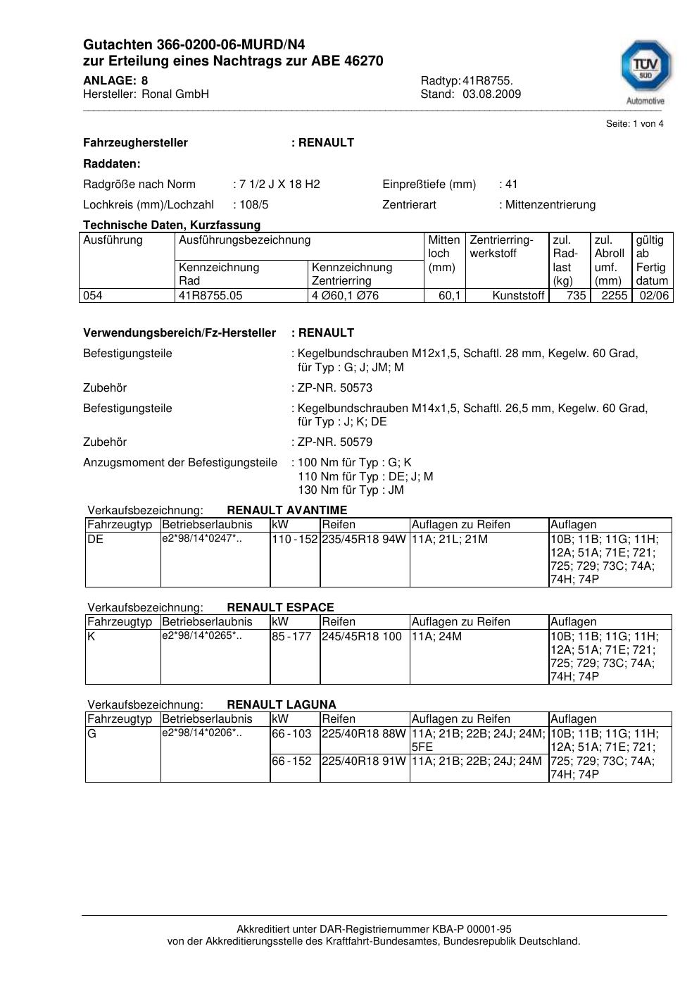 Dieses Gutachten (abe) bezieht sich auf die Alufelge Ronal 41R8755 in der Ausführung 2Jx18 ET 0, Mittenloch 0 mm (KBA 46270). Im PDF findest du typischerweise zulässige Reifengrößen, Auflagen/Anbauhinweise und – je nach Dokument – Hinweise zur Eintragung.