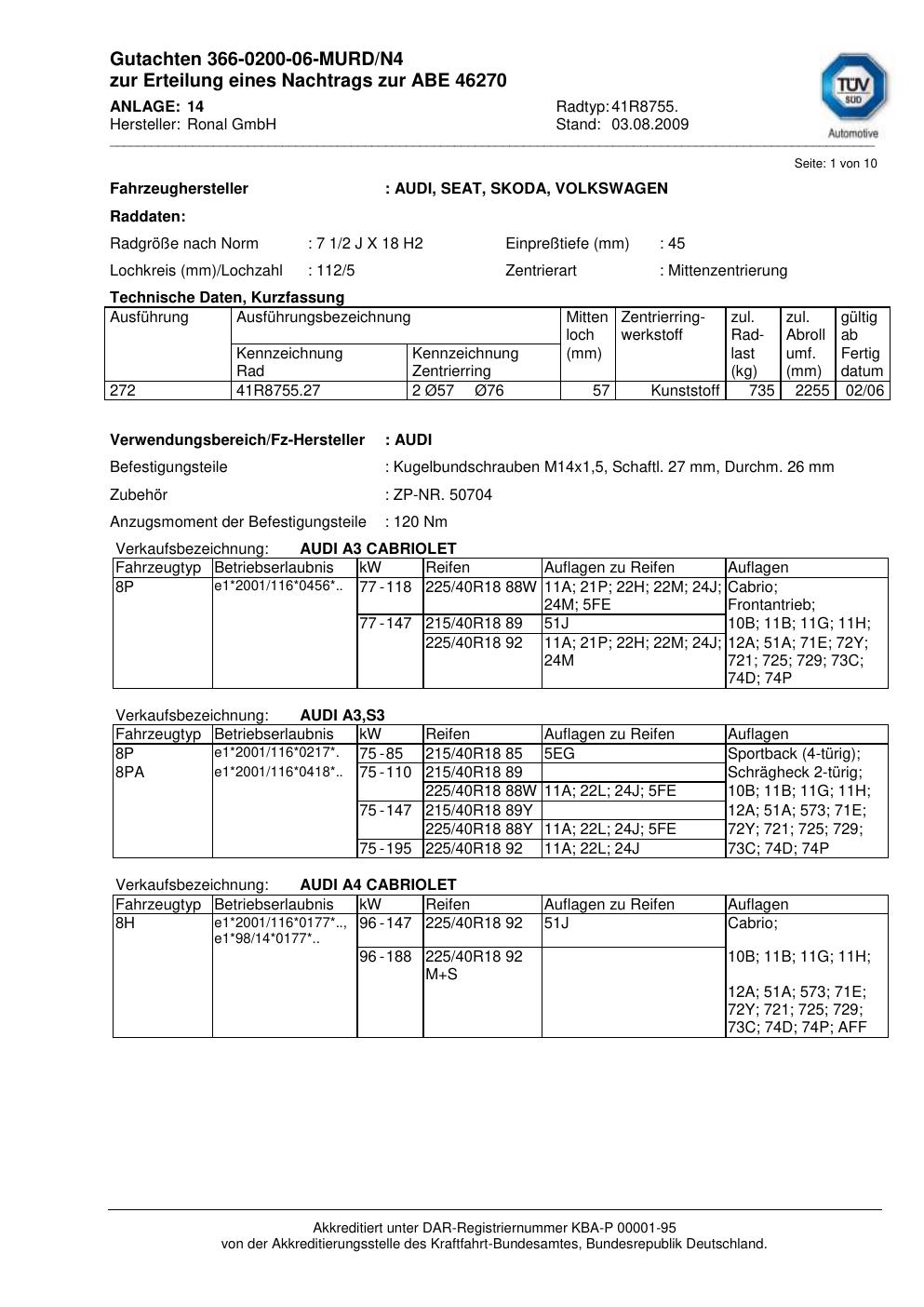 Dieses Gutachten (abe) bezieht sich auf die Alufelge Ronal 41R8755 in der Ausführung 2Jx18 ET 0, Mittenloch 0 mm (KBA 46270). Im PDF findest du typischerweise zulässige Reifengrößen, Auflagen/Anbauhinweise und – je nach Dokument – Hinweise zur Eintragung.