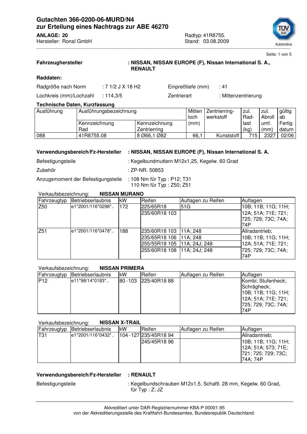 Dieses Gutachten (abe) bezieht sich auf die Alufelge Ronal 41R8755 in der Ausführung 2Jx18 ET 0, Mittenloch 0 mm (KBA 46270). Im PDF findest du typischerweise zulässige Reifengrößen, Auflagen/Anbauhinweise und – je nach Dokument – Hinweise zur Eintragung.