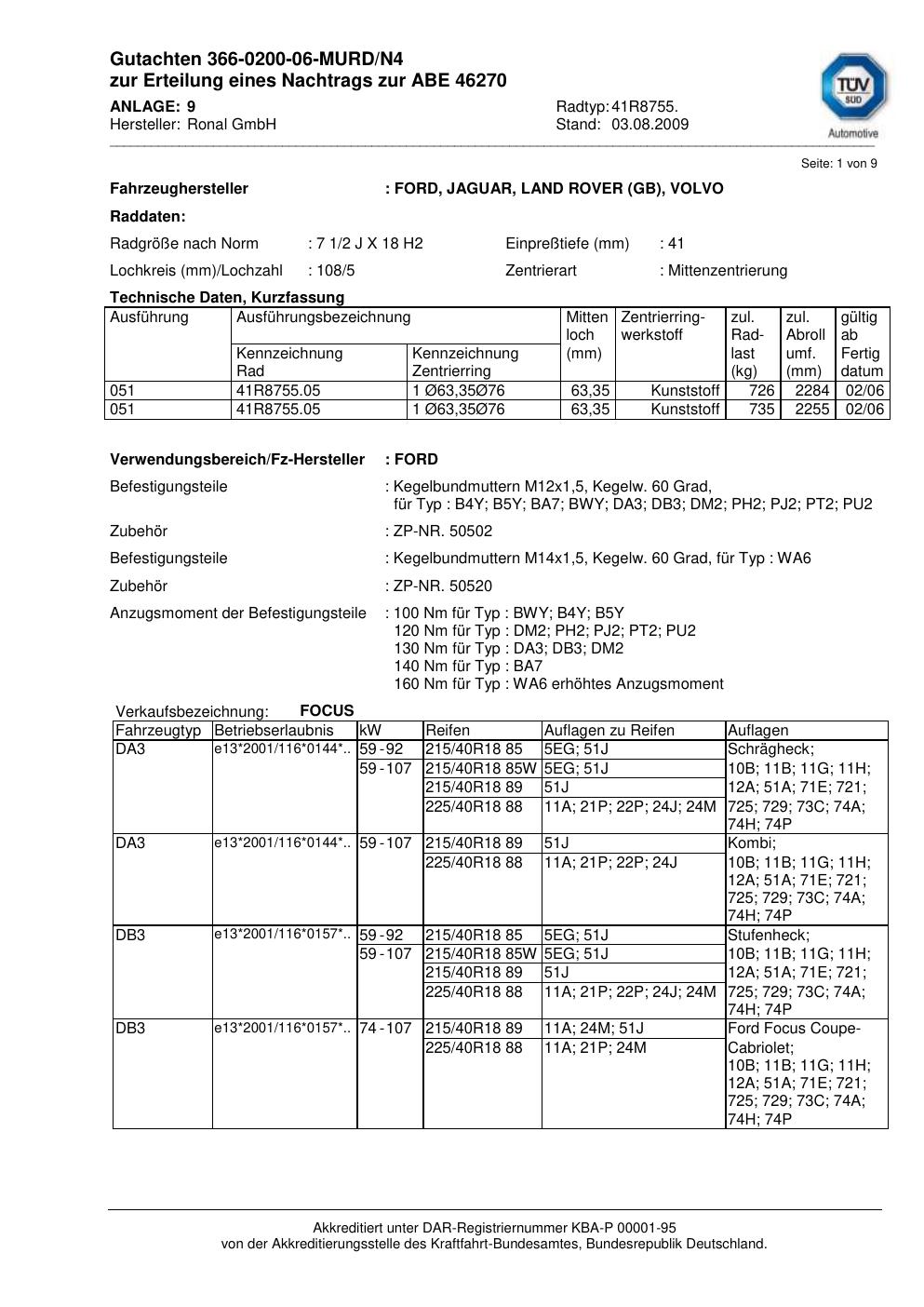 Dieses Gutachten (abe) bezieht sich auf die Alufelge Ronal 41R8755 in der Ausführung 2Jx18 ET 0, Mittenloch 0 mm (KBA 46270). Im PDF findest du typischerweise zulässige Reifengrößen, Auflagen/Anbauhinweise und – je nach Dokument – Hinweise zur Eintragung.