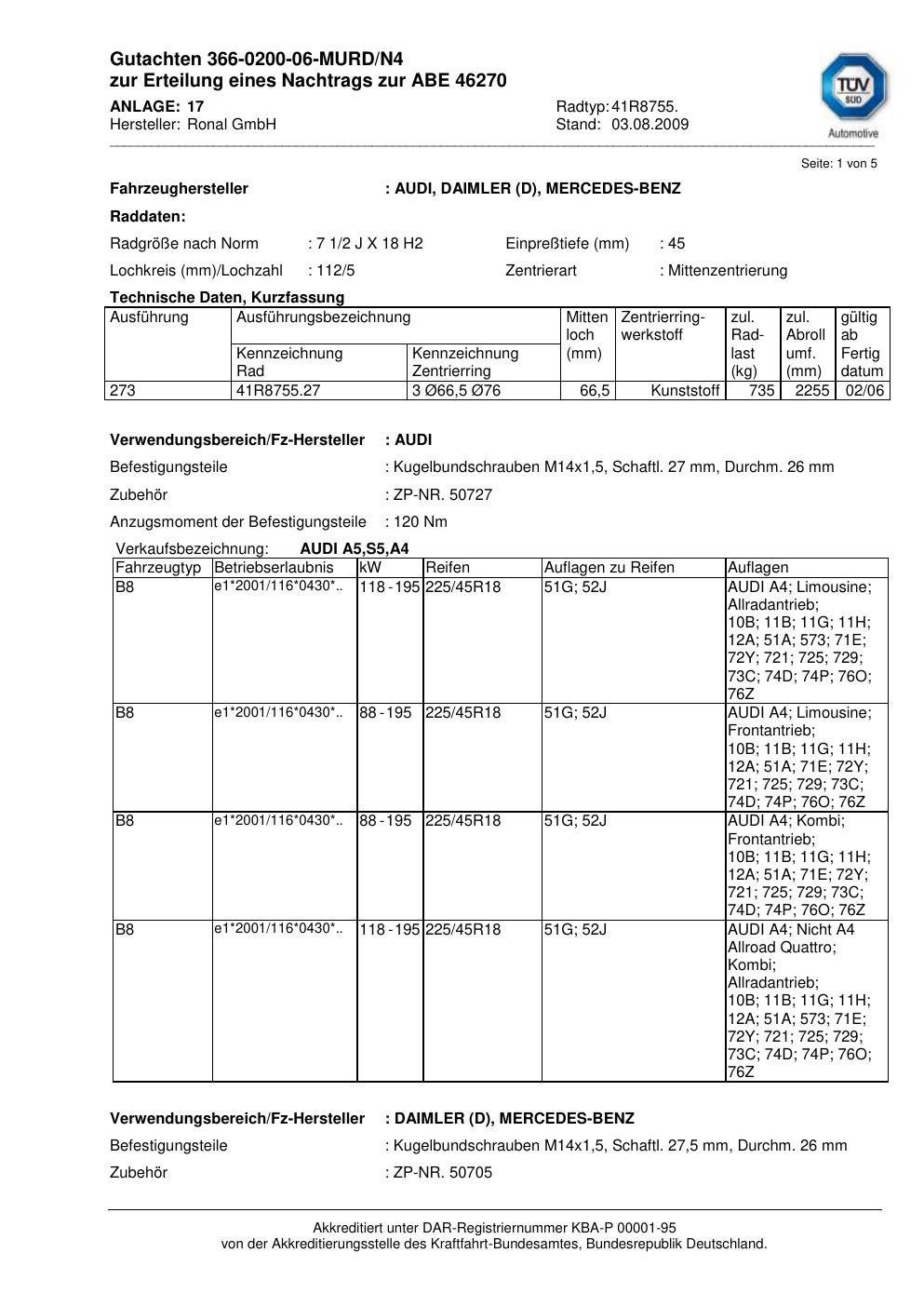 Dieses Gutachten (abe) bezieht sich auf die Alufelge Ronal 41R8755 in der Ausführung 2Jx18 ET 0, Mittenloch 0 mm (KBA 46270). Im PDF findest du typischerweise zulässige Reifengrößen, Auflagen/Anbauhinweise und – je nach Dokument – Hinweise zur Eintragung.