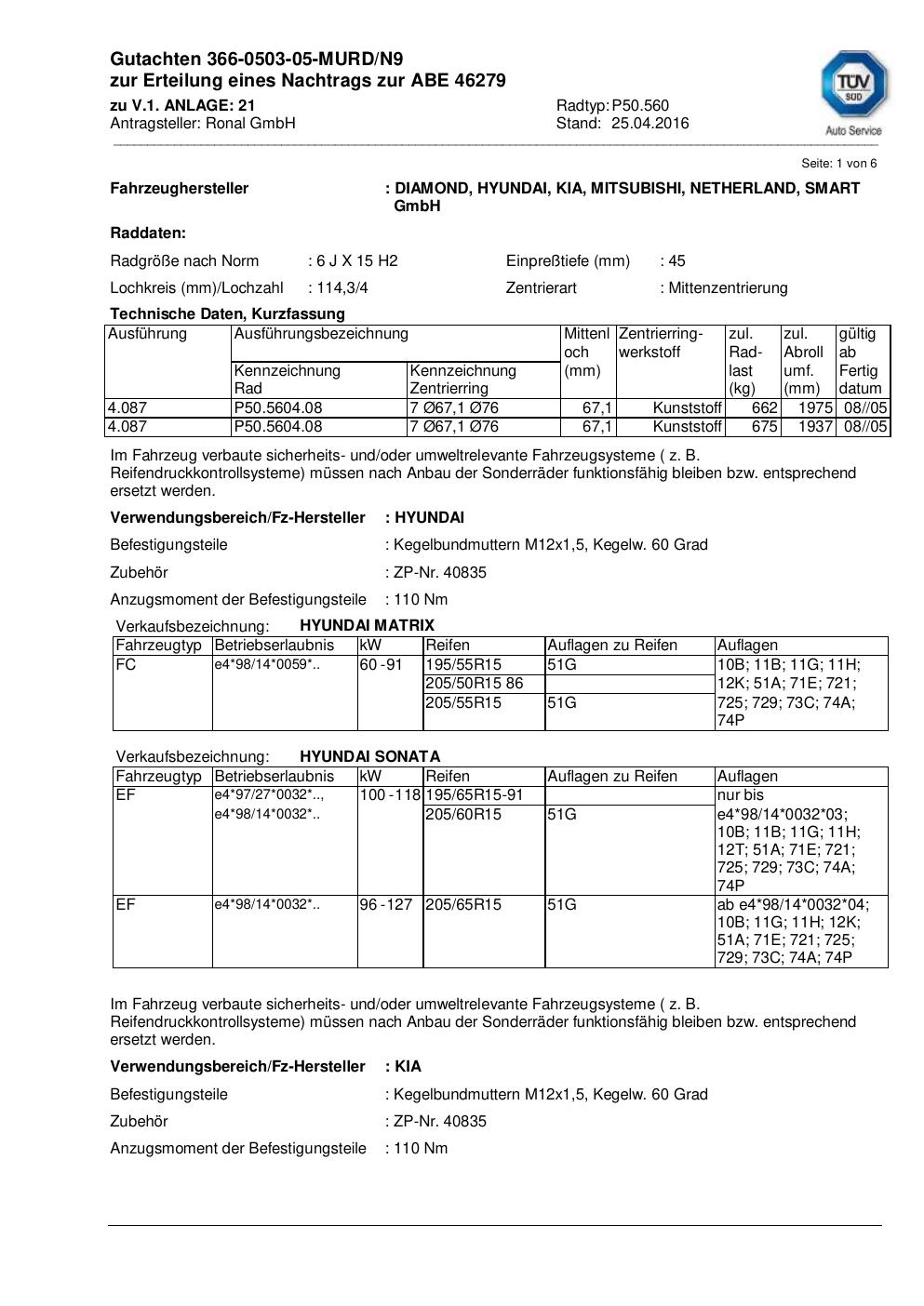 Passend für: DIAMOND, HYUNDAI, KIA, MITSUBISHI, NETHERLAND, SMART (6 Hersteller, 6 Varianten)