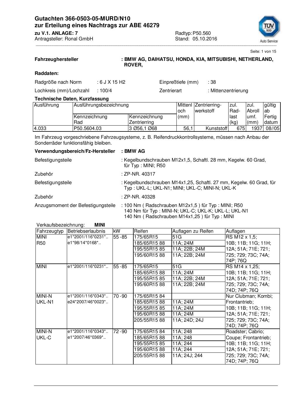 Dieses Gutachten (abe) bezieht sich auf die Alufelge ATS P50.560 in der Ausführung 6Jx15 ET 0, Mittenloch 0 mm (KBA 46279). Im PDF findest du typischerweise zulässige Reifengrößen, Auflagen/Anbauhinweise und – je nach Dokument – Hinweise zur Eintragung.