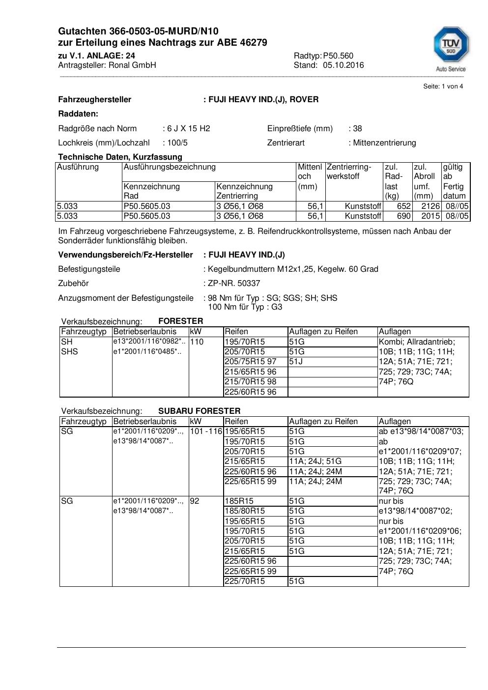 Dieses Gutachten (abe) bezieht sich auf die Alufelge ATS P50.560 in der Ausführung 6Jx15 ET 0, Mittenloch 0 mm (KBA 46279). Im PDF findest du typischerweise zulässige Reifengrößen, Auflagen/Anbauhinweise und – je nach Dokument – Hinweise zur Eintragung.