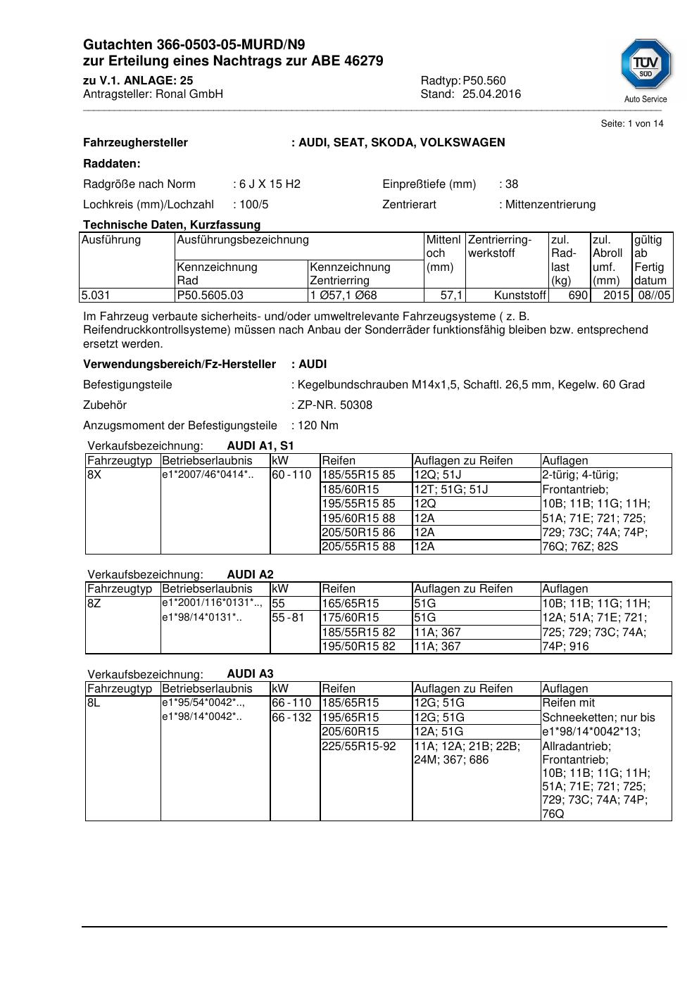 Dieses Gutachten (abe) bezieht sich auf die Alufelge ATS P50.560 in der Ausführung 6Jx15 ET 0, Mittenloch 0 mm (KBA 46279). Im PDF findest du typischerweise zulässige Reifengrößen, Auflagen/Anbauhinweise und – je nach Dokument – Hinweise zur Eintragung.