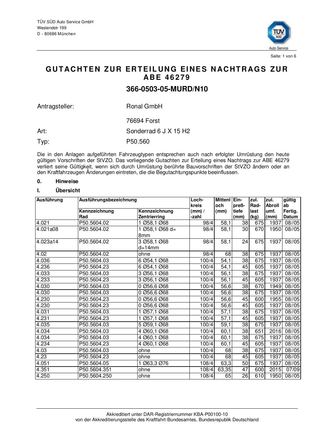 Dieses Gutachten (abe) bezieht sich auf die Alufelge ATS P50.560 in der Ausführung 6Jx15 ET 0, Mittenloch 0 mm (KBA 46279). Im PDF findest du typischerweise zulässige Reifengrößen, Auflagen/Anbauhinweise und – je nach Dokument – Hinweise zur Eintragung.