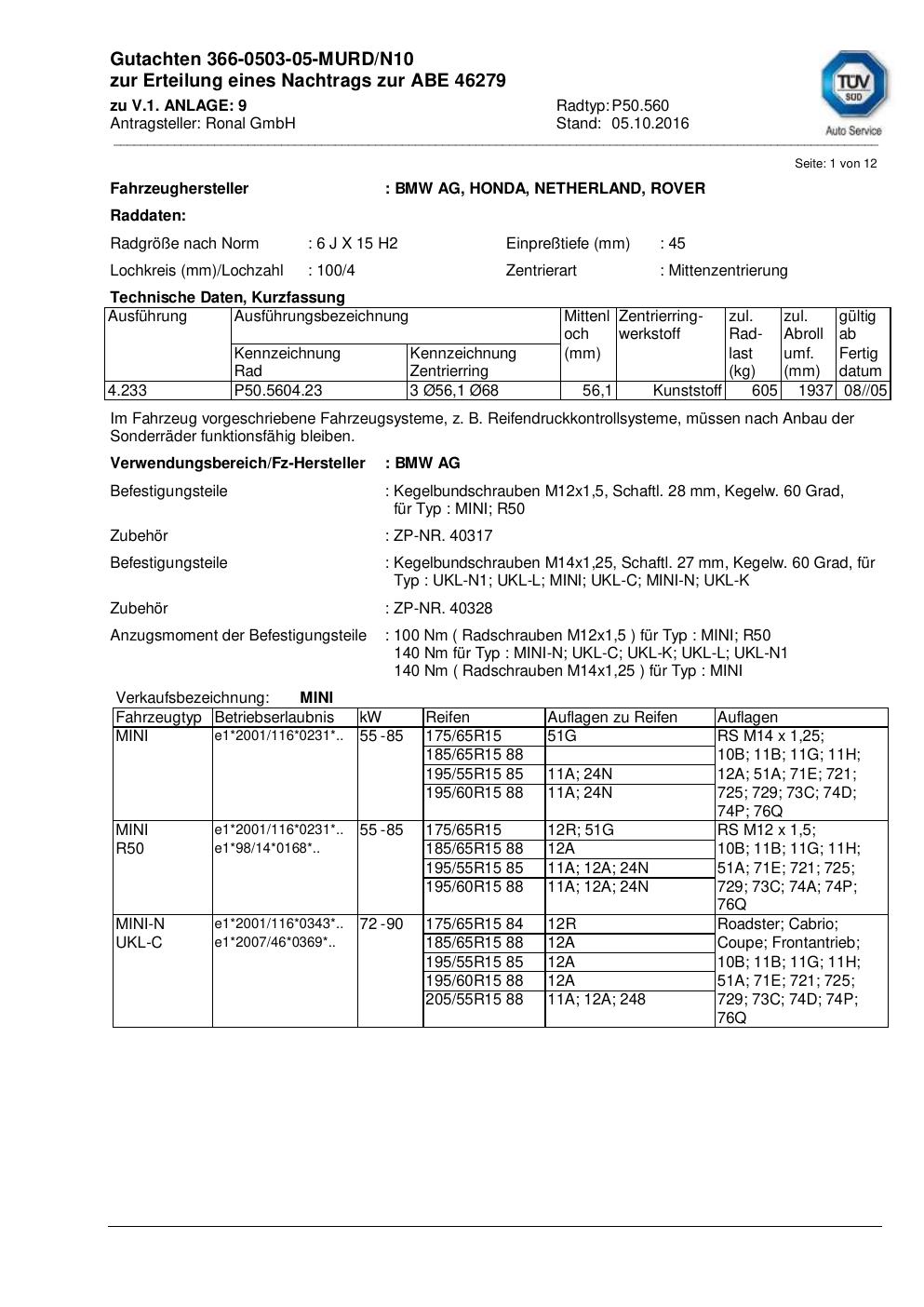 Dieses Gutachten (abe) bezieht sich auf die Alufelge ATS P50.560 in der Ausführung 6Jx15 ET 0, Mittenloch 0 mm (KBA 46279). Im PDF findest du typischerweise zulässige Reifengrößen, Auflagen/Anbauhinweise und – je nach Dokument – Hinweise zur Eintragung.
