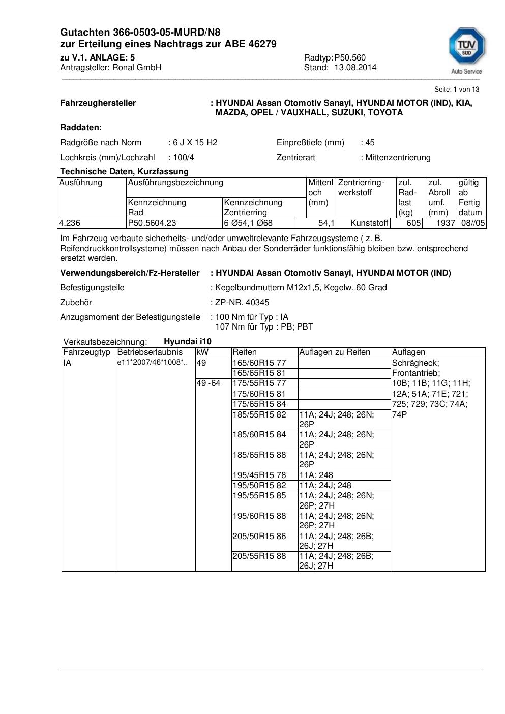 Dieses Gutachten (abe) bezieht sich auf die Alufelge ATS P50.560 in der Ausführung 6Jx15 ET 0, Mittenloch 0 mm (KBA 46279). Im PDF findest du typischerweise zulässige Reifengrößen, Auflagen/Anbauhinweise und – je nach Dokument – Hinweise zur Eintragung.