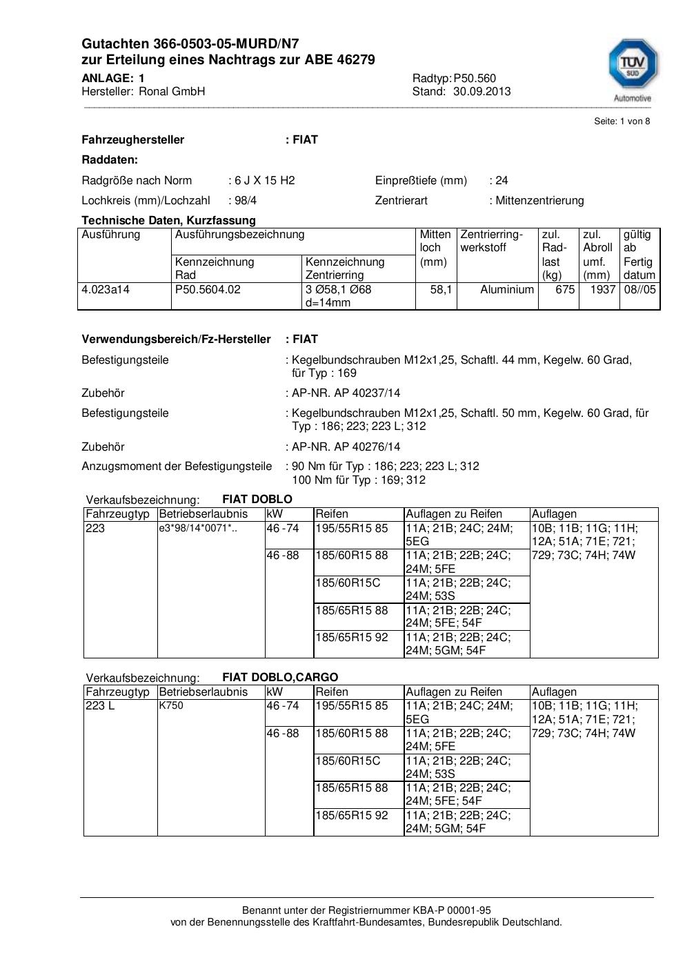 Dieses Gutachten (abe) bezieht sich auf die Alufelge Ronal P50.560 in der Ausführung 6Jx15 ET 0, Mittenloch 0 mm (KBA 46279). Im PDF findest du typischerweise zulässige Reifengrößen, Auflagen/Anbauhinweise und – je nach Dokument – Hinweise zur Eintragung.