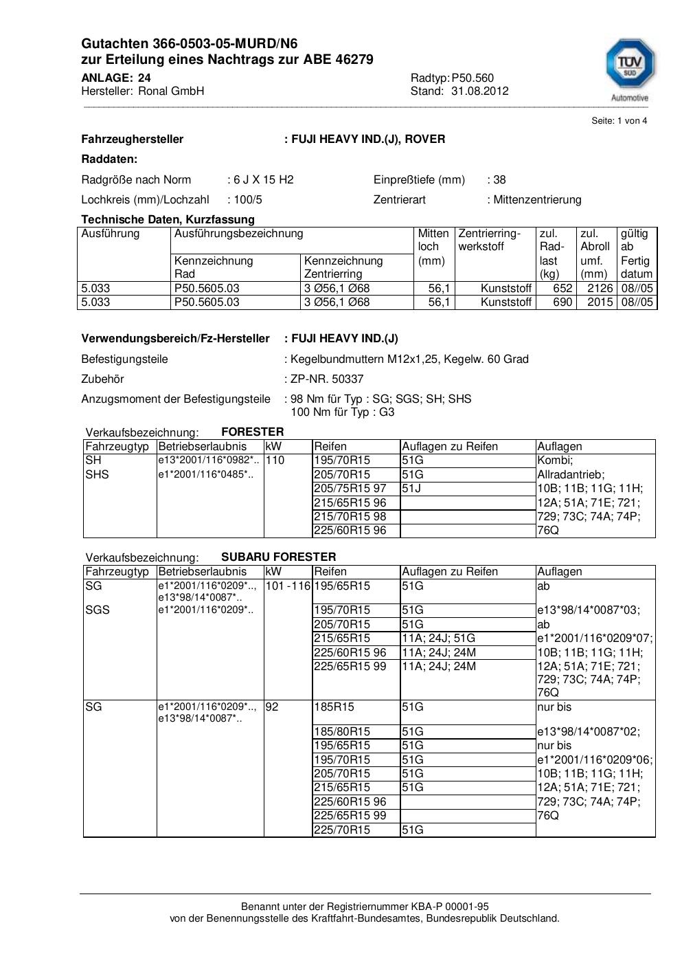 Dieses Gutachten (abe) bezieht sich auf die Alufelge Ronal P50.560 in der Ausführung 6Jx15 ET 0, Mittenloch 0 mm (KBA 46279). Im PDF findest du typischerweise zulässige Reifengrößen, Auflagen/Anbauhinweise und – je nach Dokument – Hinweise zur Eintragung.