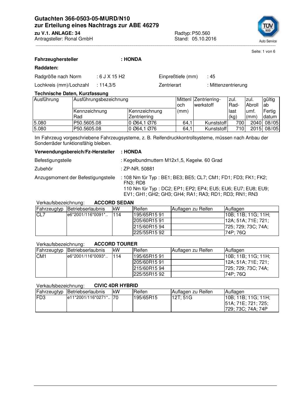 Dieses Gutachten (abe) bezieht sich auf die Alufelge Ronal P50.560 in der Ausführung 6Jx15 ET 0, Mittenloch 0 mm (KBA 46279). Im PDF findest du typischerweise zulässige Reifengrößen, Auflagen/Anbauhinweise und – je nach Dokument – Hinweise zur Eintragung.