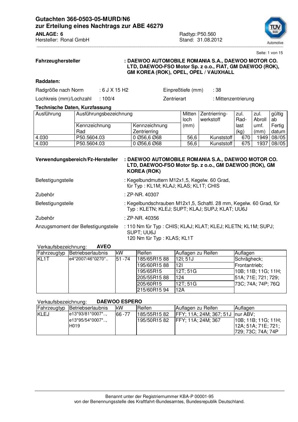 Dieses Gutachten (abe) bezieht sich auf die Alufelge Ronal P50.560 in der Ausführung 6Jx15 ET 0, Mittenloch 0 mm (KBA 46279). Im PDF findest du typischerweise zulässige Reifengrößen, Auflagen/Anbauhinweise und – je nach Dokument – Hinweise zur Eintragung.