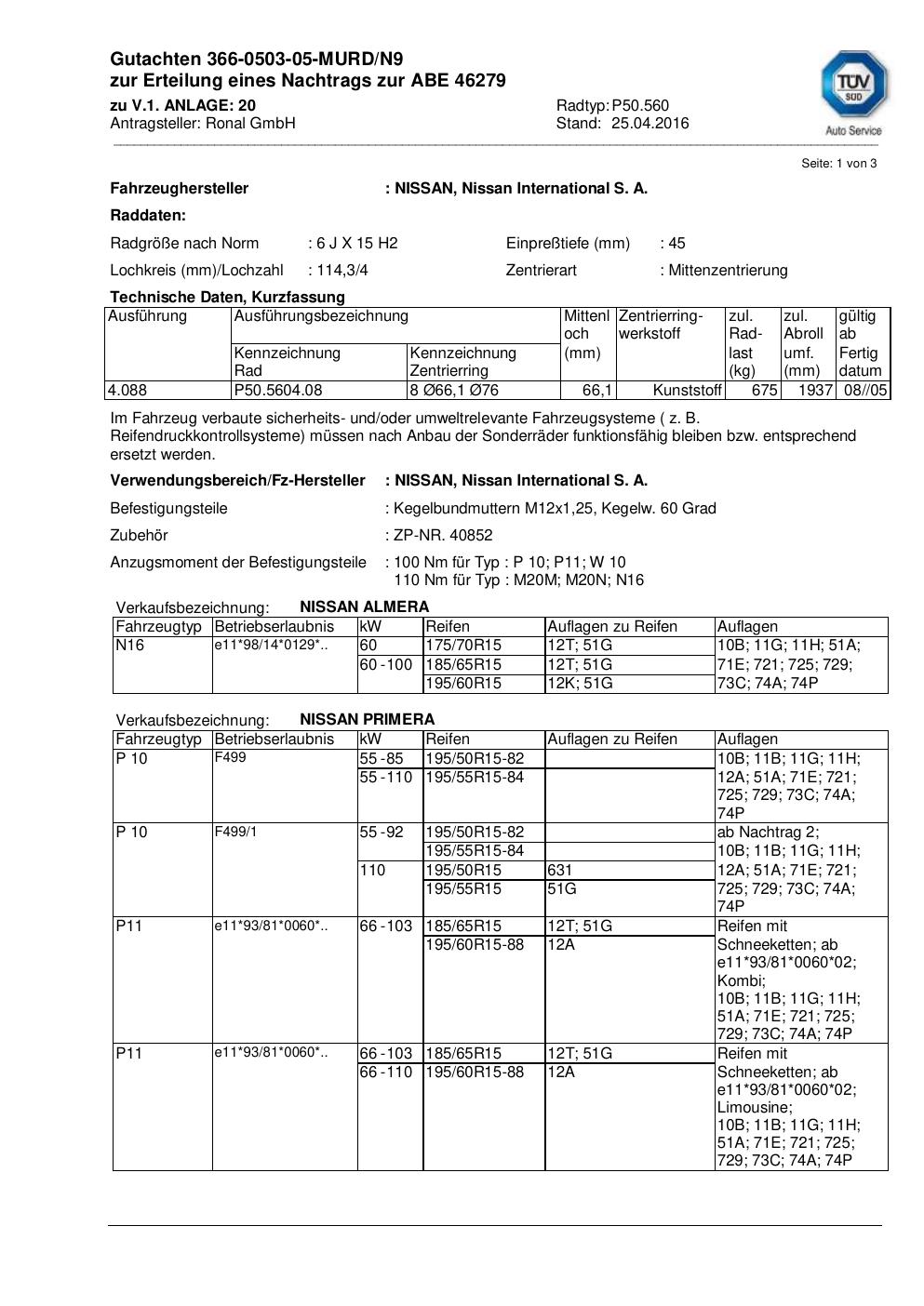 Dieses Gutachten (abe) bezieht sich auf die Alufelge Ronal P50.560 in der Ausführung 6Jx15 ET 0, Mittenloch 0 mm (KBA 46279). Im PDF findest du typischerweise zulässige Reifengrößen, Auflagen/Anbauhinweise und – je nach Dokument – Hinweise zur Eintragung.