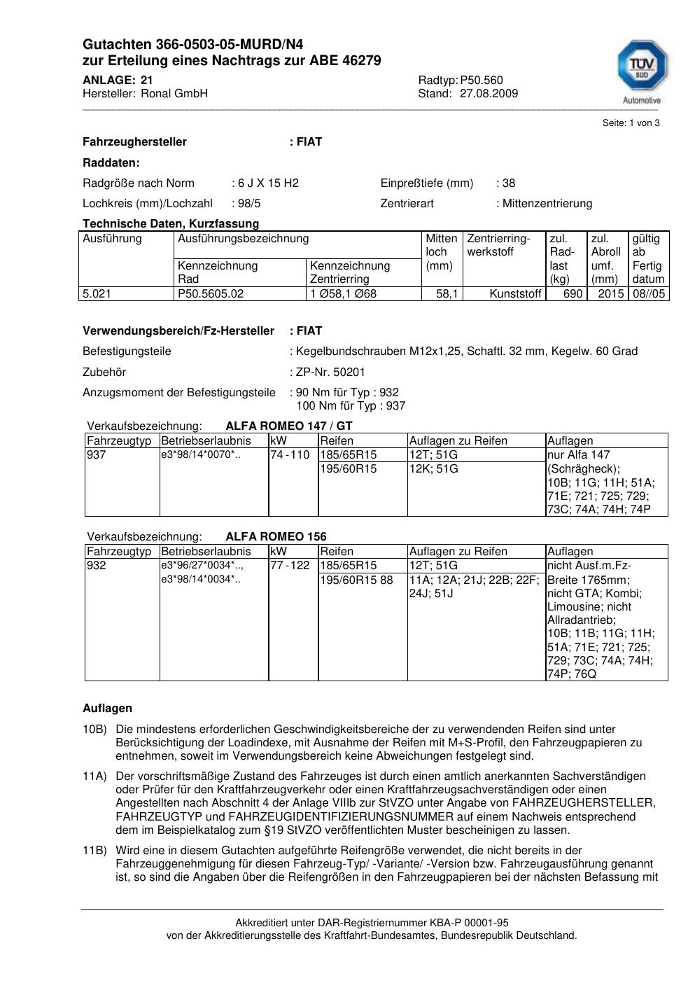 Felgengutachten / abe für Alufelgen Ronal P50.560 (6Jx15 ET 0, Mittenloch 0 mm) mit KBA 46279 (Zertifikatsnummer 46279). Hier kostenlos als PDF herunterladen. Der Download-Link ist 24 Stunden gültig und kann bis zu zwei Mal verwendet werden.