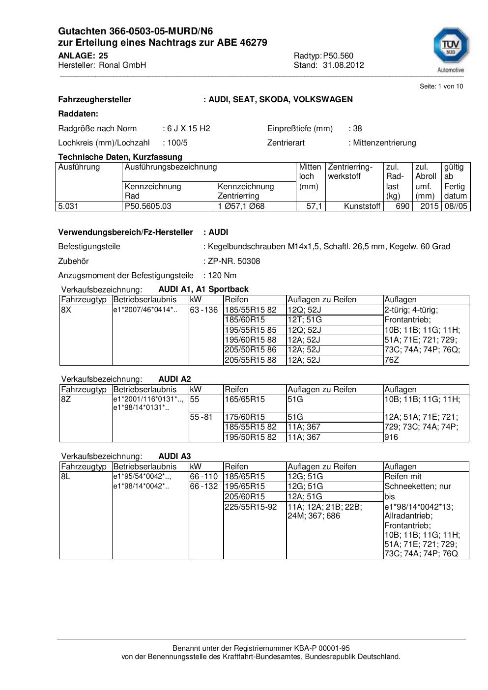 Dieses Gutachten (abe) bezieht sich auf die Alufelge Ronal P50.560 in der Ausführung 6Jx15 ET 0, Mittenloch 0 mm (KBA 46279). Im PDF findest du typischerweise zulässige Reifengrößen, Auflagen/Anbauhinweise und – je nach Dokument – Hinweise zur Eintragung.
