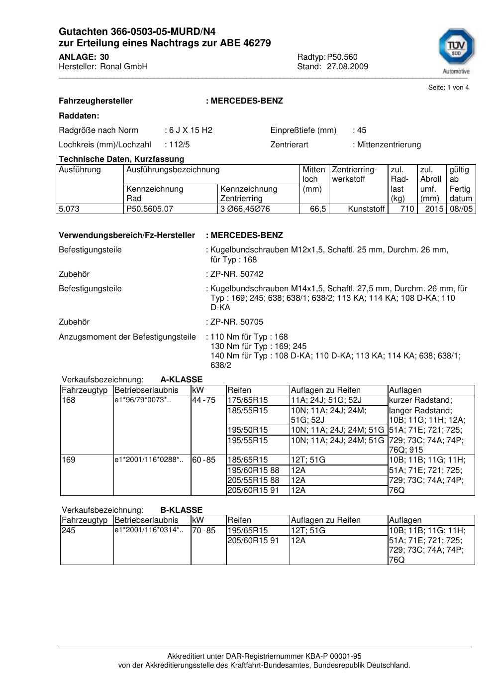Dieses Gutachten (abe) bezieht sich auf die Alufelge Ronal P50.560 in der Ausführung 6Jx15 ET 0, Mittenloch 0 mm (KBA 46279). Im PDF findest du typischerweise zulässige Reifengrößen, Auflagen/Anbauhinweise und – je nach Dokument – Hinweise zur Eintragung.