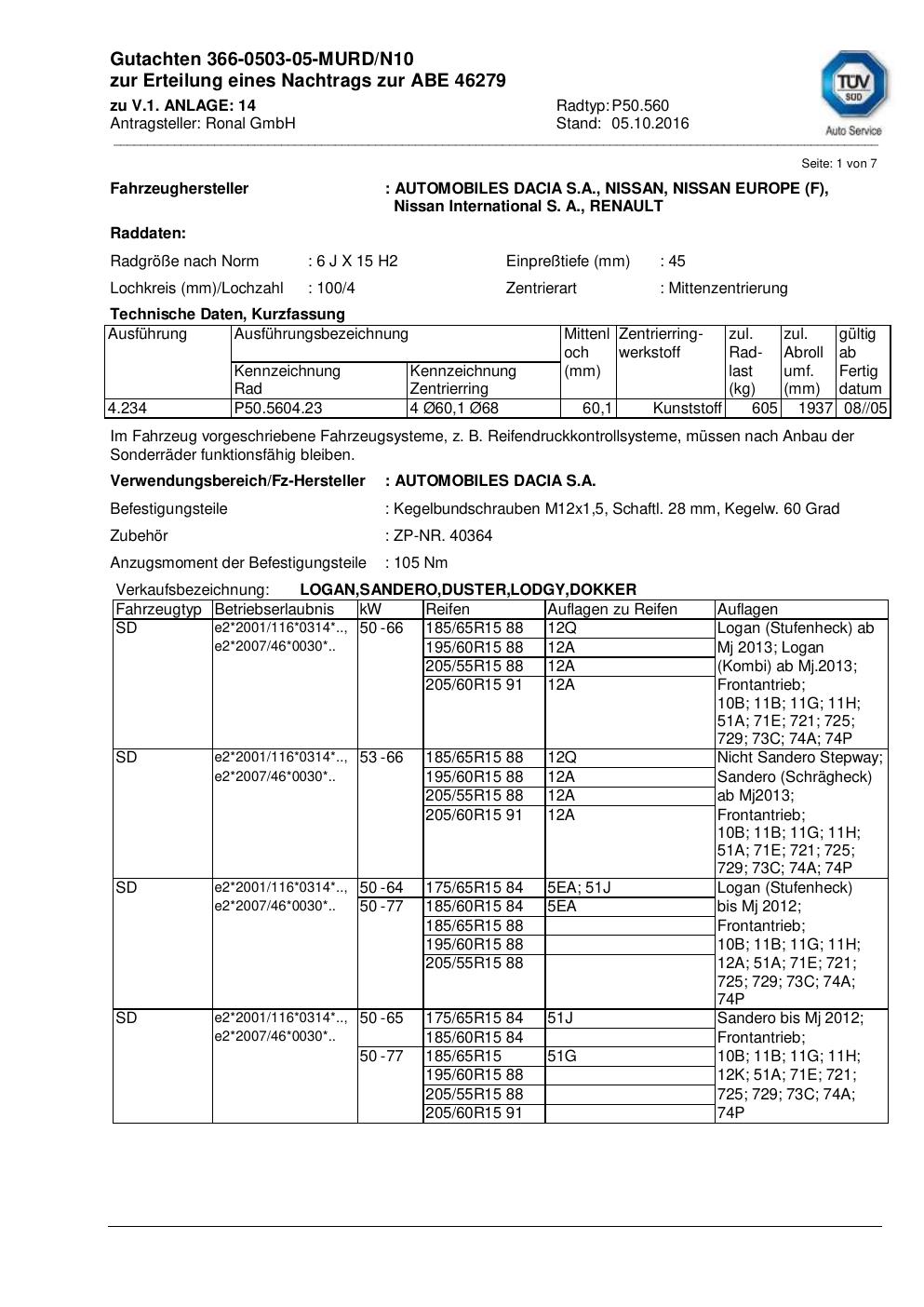Dieses Gutachten (abe) bezieht sich auf die Alufelge Ronal P50.560 in der Ausführung 6Jx15 ET 0, Mittenloch 0 mm (KBA 46279). Im PDF findest du typischerweise zulässige Reifengrößen, Auflagen/Anbauhinweise und – je nach Dokument – Hinweise zur Eintragung.