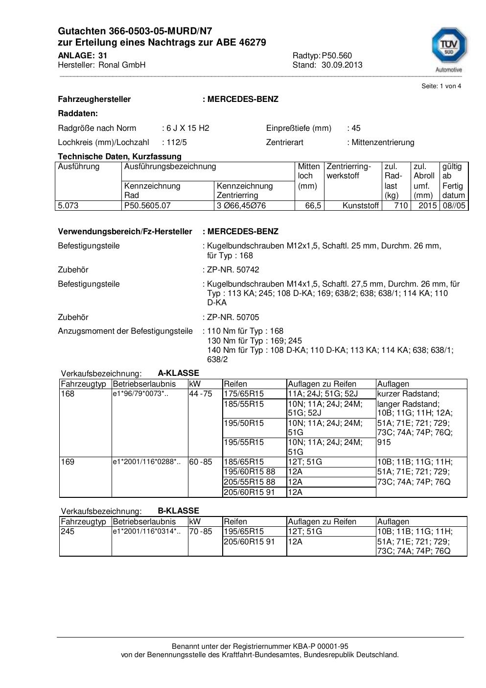 Dieses Gutachten (abe) bezieht sich auf die Alufelge Ronal P50.560 in der Ausführung 6Jx15 ET 0, Mittenloch 0 mm (KBA 46279). Im PDF findest du typischerweise zulässige Reifengrößen, Auflagen/Anbauhinweise und – je nach Dokument – Hinweise zur Eintragung.