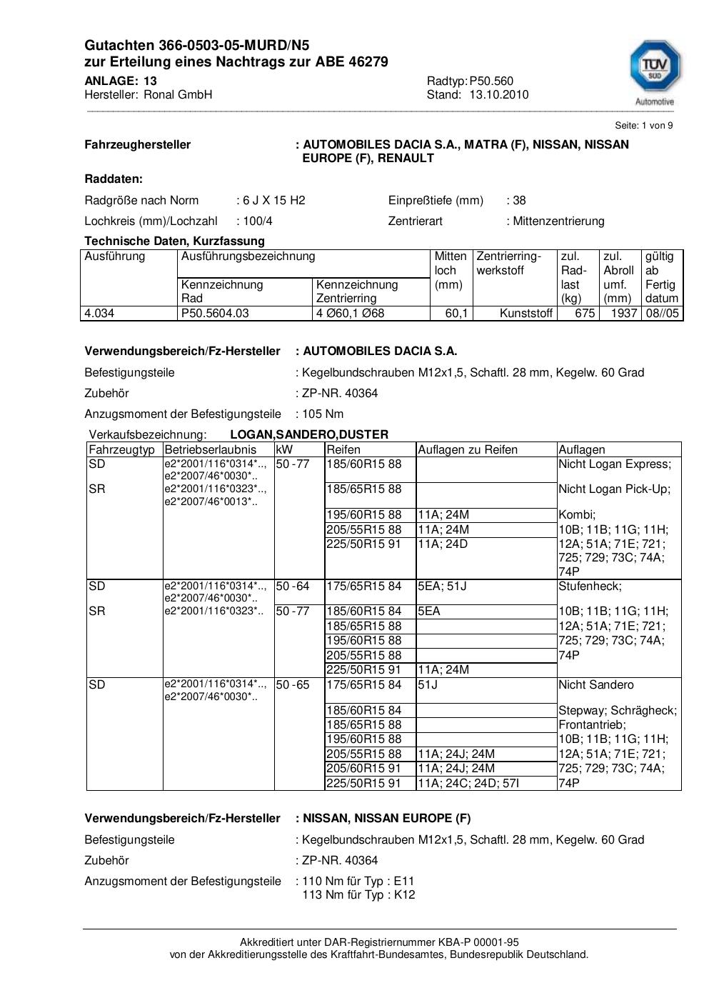 Dieses Gutachten (abe) bezieht sich auf die Alufelge Ronal P50.560 in der Ausführung 6Jx15 ET 0, Mittenloch 0 mm (KBA 46279). Im PDF findest du typischerweise zulässige Reifengrößen, Auflagen/Anbauhinweise und – je nach Dokument – Hinweise zur Eintragung.