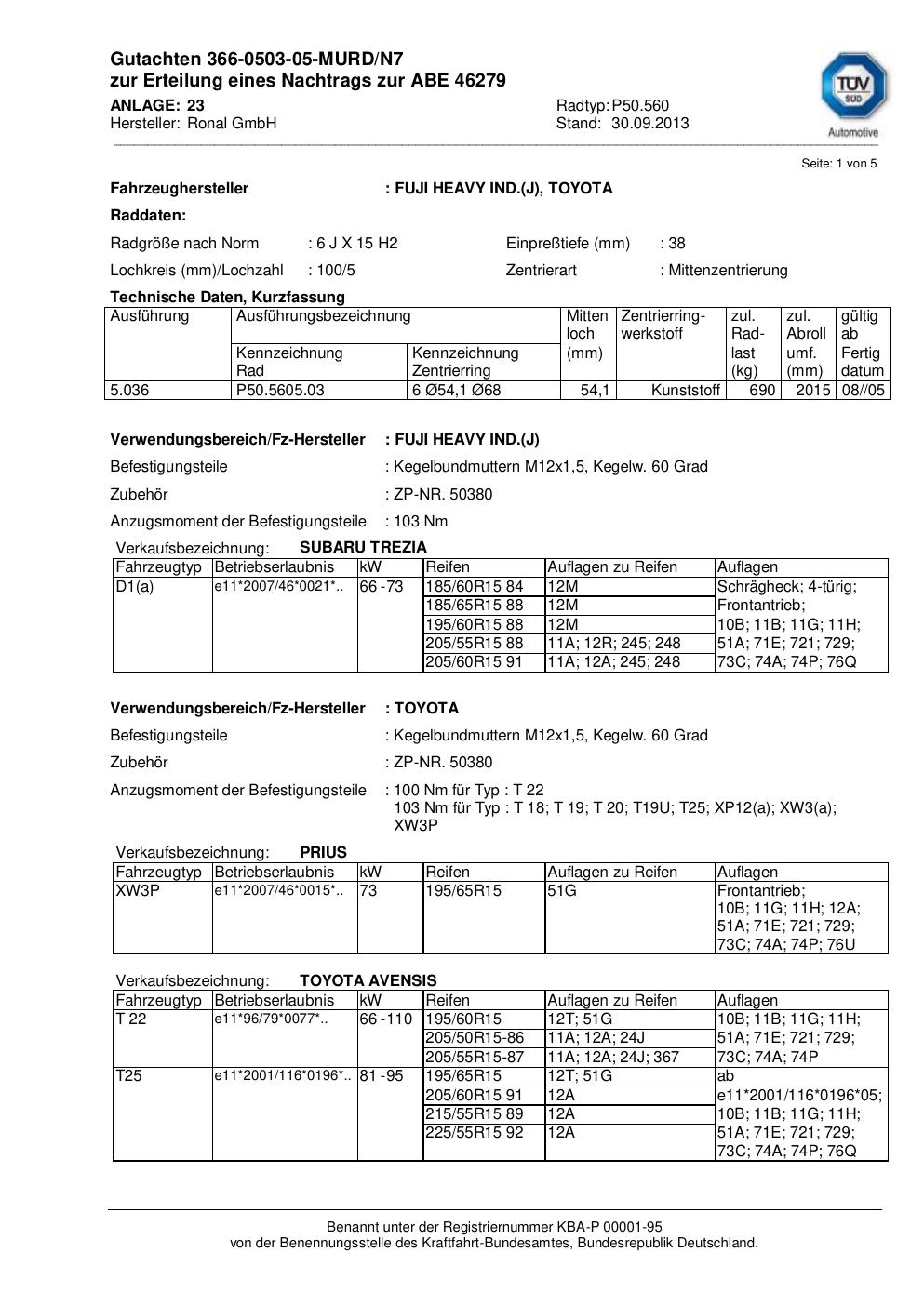 Dieses Gutachten (abe) bezieht sich auf die Alufelge Ronal P50.560 in der Ausführung 6Jx15 ET 0, Mittenloch 0 mm (KBA 46279). Im PDF findest du typischerweise zulässige Reifengrößen, Auflagen/Anbauhinweise und – je nach Dokument – Hinweise zur Eintragung.