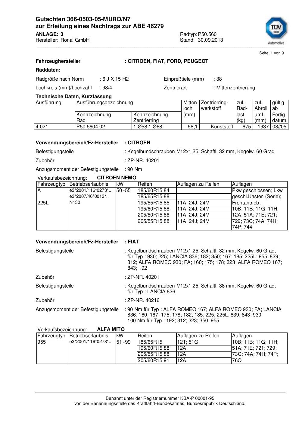Dieses Gutachten (abe) bezieht sich auf die Alufelge Ronal P50.560 in der Ausführung 6Jx15 ET 0, Mittenloch 0 mm (KBA 46279). Im PDF findest du typischerweise zulässige Reifengrößen, Auflagen/Anbauhinweise und – je nach Dokument – Hinweise zur Eintragung.