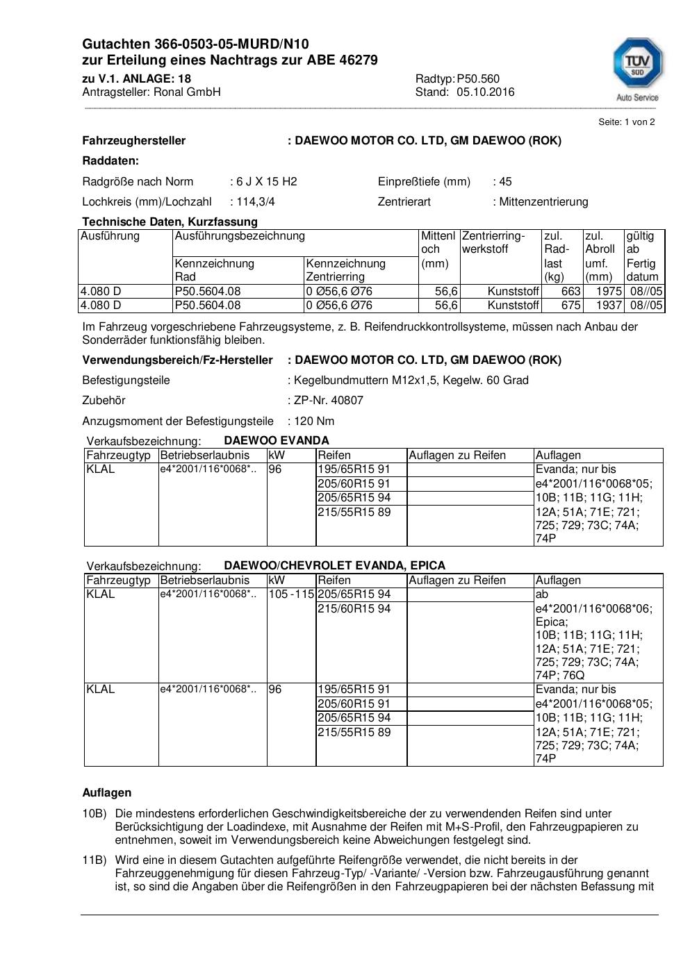 Dieses Gutachten (abe) bezieht sich auf die Alufelge Ronal P50.560 in der Ausführung 6Jx15 ET 0, Mittenloch 0 mm (KBA 46279). Im PDF findest du typischerweise zulässige Reifengrößen, Auflagen/Anbauhinweise und – je nach Dokument – Hinweise zur Eintragung.