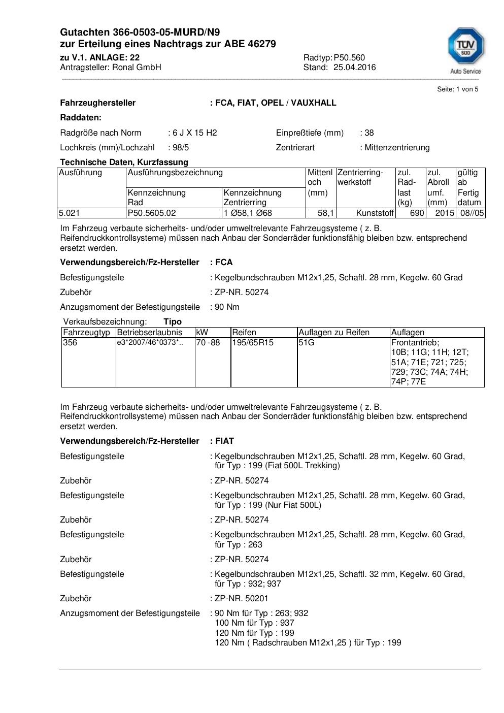 Dieses Gutachten (abe) bezieht sich auf die Alufelge Ronal P50.560 in der Ausführung 6Jx15 ET 0, Mittenloch 0 mm (KBA 46279). Im PDF findest du typischerweise zulässige Reifengrößen, Auflagen/Anbauhinweise und – je nach Dokument – Hinweise zur Eintragung.