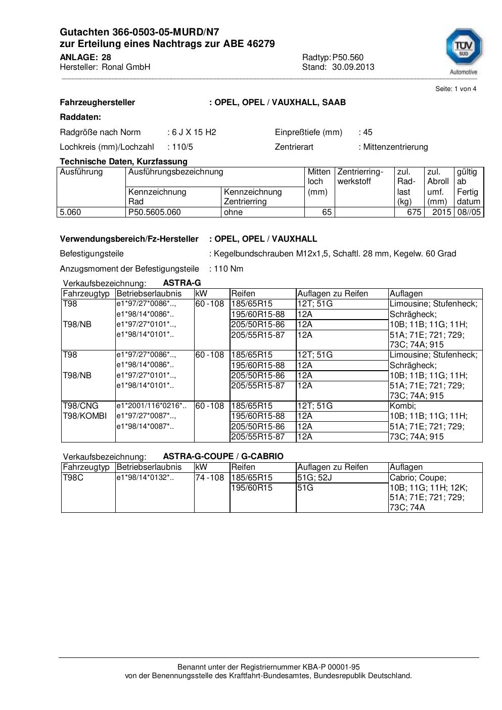 Dieses Gutachten (abe) bezieht sich auf die Alufelge Ronal P50.560 in der Ausführung 6Jx15 ET 0, Mittenloch 0 mm (KBA 46279). Im PDF findest du typischerweise zulässige Reifengrößen, Auflagen/Anbauhinweise und – je nach Dokument – Hinweise zur Eintragung.