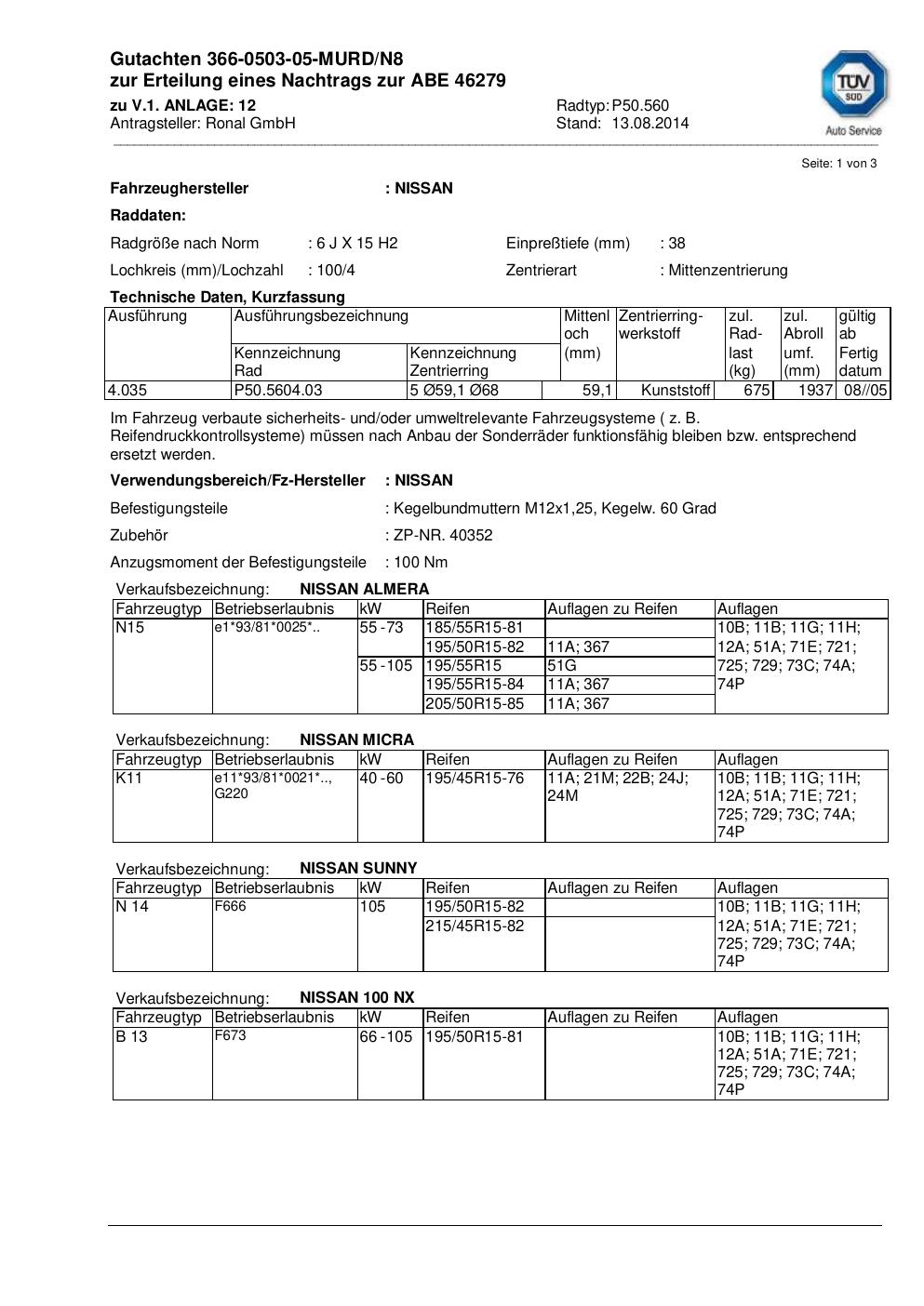 Dieses Gutachten (abe) bezieht sich auf die Alufelge Ronal P50.560 in der Ausführung 6Jx15 ET 0, Mittenloch 0 mm (KBA 46279). Im PDF findest du typischerweise zulässige Reifengrößen, Auflagen/Anbauhinweise und – je nach Dokument – Hinweise zur Eintragung.