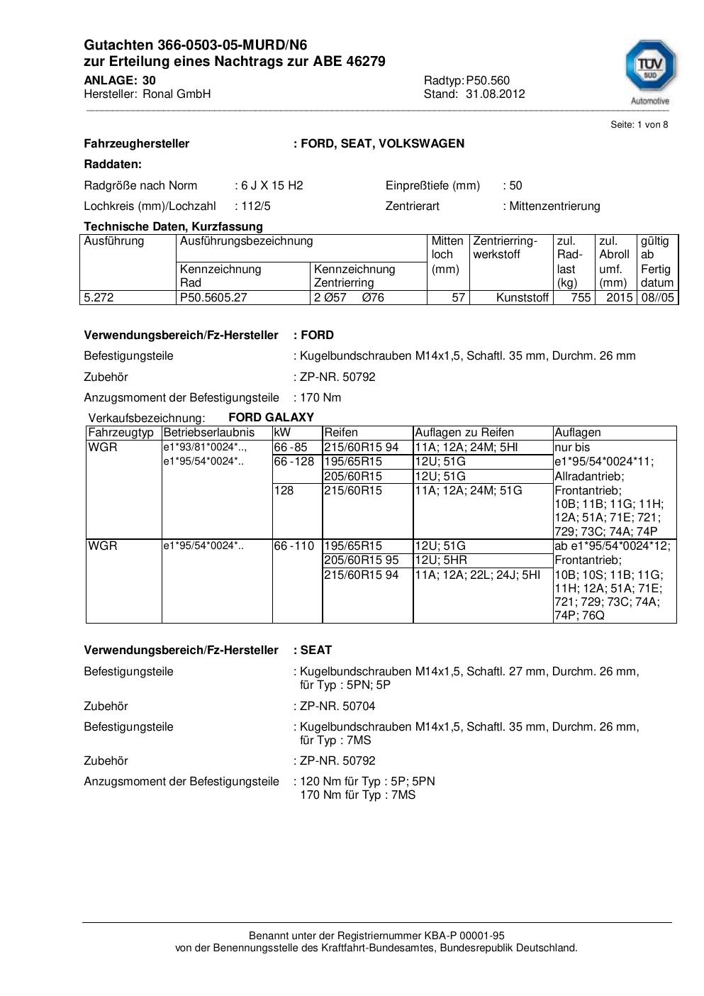 Dieses Gutachten (abe) bezieht sich auf die Alufelge Ronal P50.560 in der Ausführung 6Jx15 ET 0, Mittenloch 0 mm (KBA 46279). Im PDF findest du typischerweise zulässige Reifengrößen, Auflagen/Anbauhinweise und – je nach Dokument – Hinweise zur Eintragung.