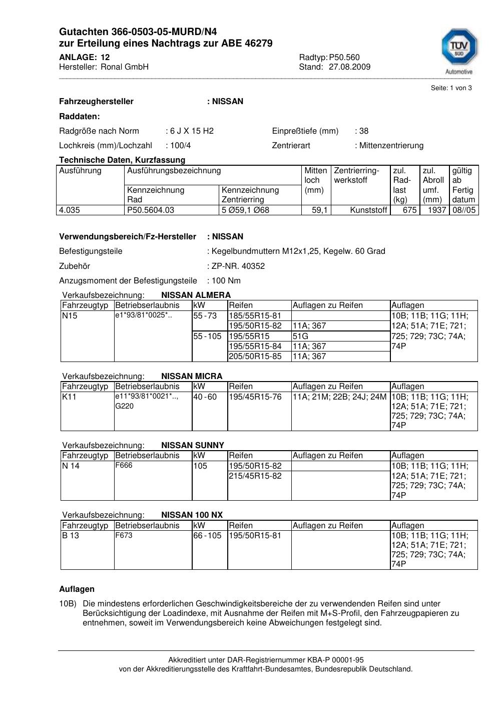 Dieses Gutachten (abe) bezieht sich auf die Alufelge Ronal P50.560 in der Ausführung 6Jx15 ET 0, Mittenloch 0 mm (KBA 46279). Im PDF findest du typischerweise zulässige Reifengrößen, Auflagen/Anbauhinweise und – je nach Dokument – Hinweise zur Eintragung.