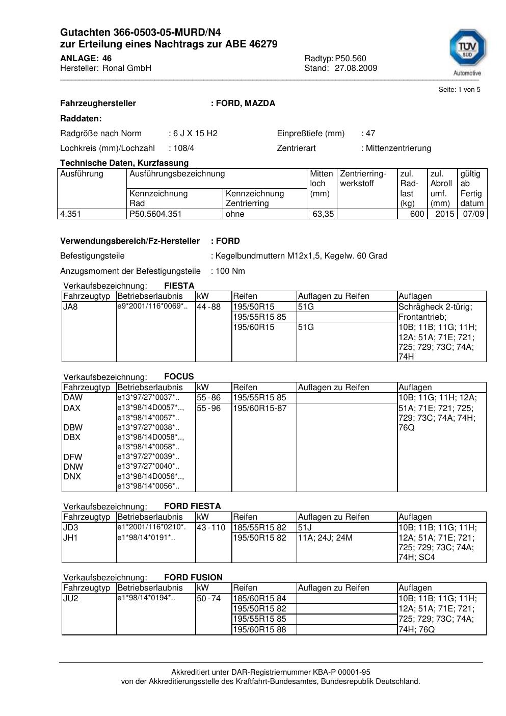 Dieses Gutachten (abe) bezieht sich auf die Alufelge Ronal P50.560 in der Ausführung 6Jx15 ET 0, Mittenloch 0 mm (KBA 46279). Im PDF findest du typischerweise zulässige Reifengrößen, Auflagen/Anbauhinweise und – je nach Dokument – Hinweise zur Eintragung.