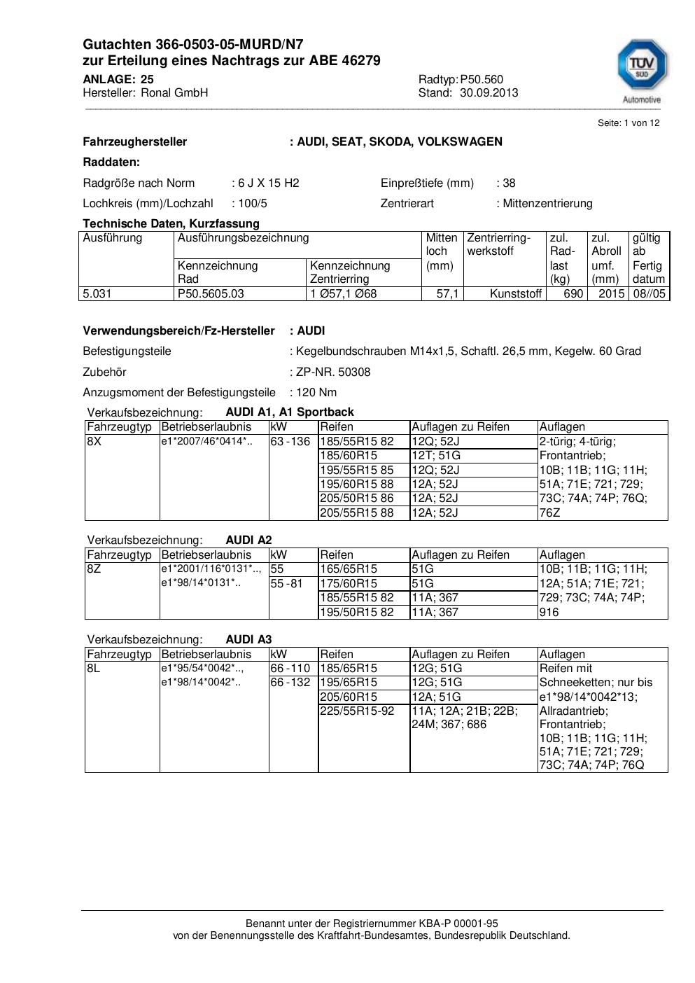 Dieses Gutachten (abe) bezieht sich auf die Alufelge Ronal P50.560 in der Ausführung 6Jx15 ET 0, Mittenloch 0 mm (KBA 46279). Im PDF findest du typischerweise zulässige Reifengrößen, Auflagen/Anbauhinweise und – je nach Dokument – Hinweise zur Eintragung.