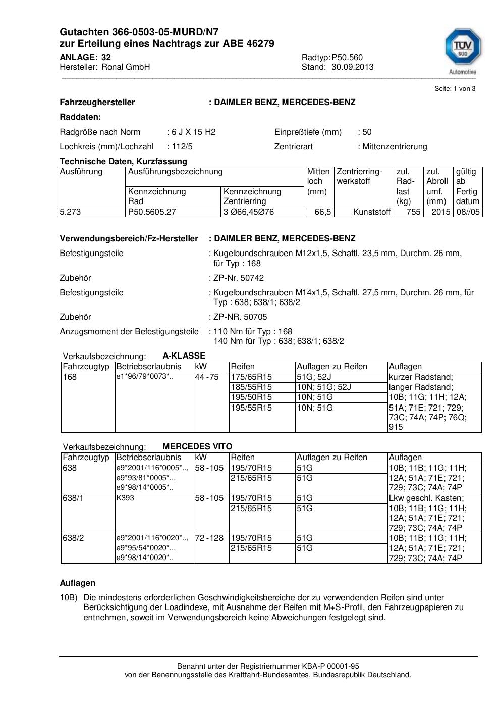 Dieses Gutachten (abe) bezieht sich auf die Alufelge Ronal P50.560 in der Ausführung 6Jx15 ET 0, Mittenloch 0 mm (KBA 46279). Im PDF findest du typischerweise zulässige Reifengrößen, Auflagen/Anbauhinweise und – je nach Dokument – Hinweise zur Eintragung.