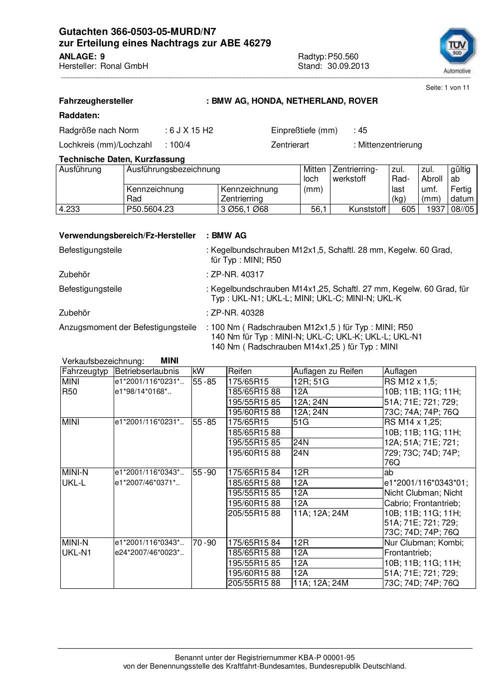 Dieses Gutachten (abe) bezieht sich auf die Alufelge Ronal P50.560 in der Ausführung 6Jx15 ET 0, Mittenloch 0 mm (KBA 46279). Im PDF findest du typischerweise zulässige Reifengrößen, Auflagen/Anbauhinweise und – je nach Dokument – Hinweise zur Eintragung.