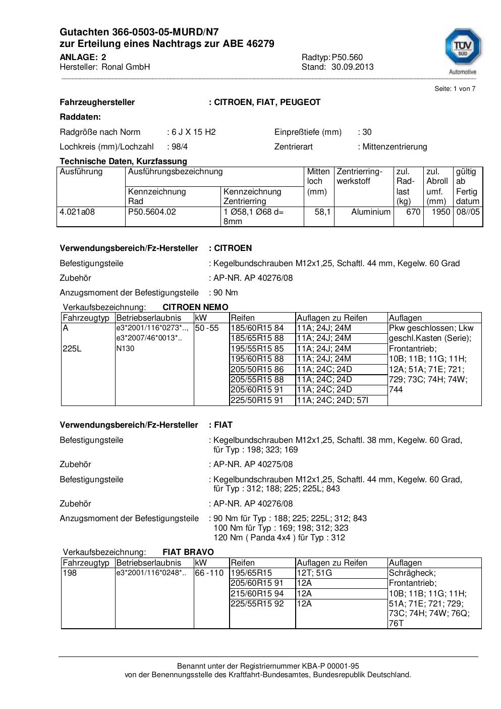Dieses Gutachten (abe) bezieht sich auf die Alufelge Ronal P50.560 in der Ausführung 6Jx15 ET 0, Mittenloch 0 mm (KBA 46279). Im PDF findest du typischerweise zulässige Reifengrößen, Auflagen/Anbauhinweise und – je nach Dokument – Hinweise zur Eintragung.